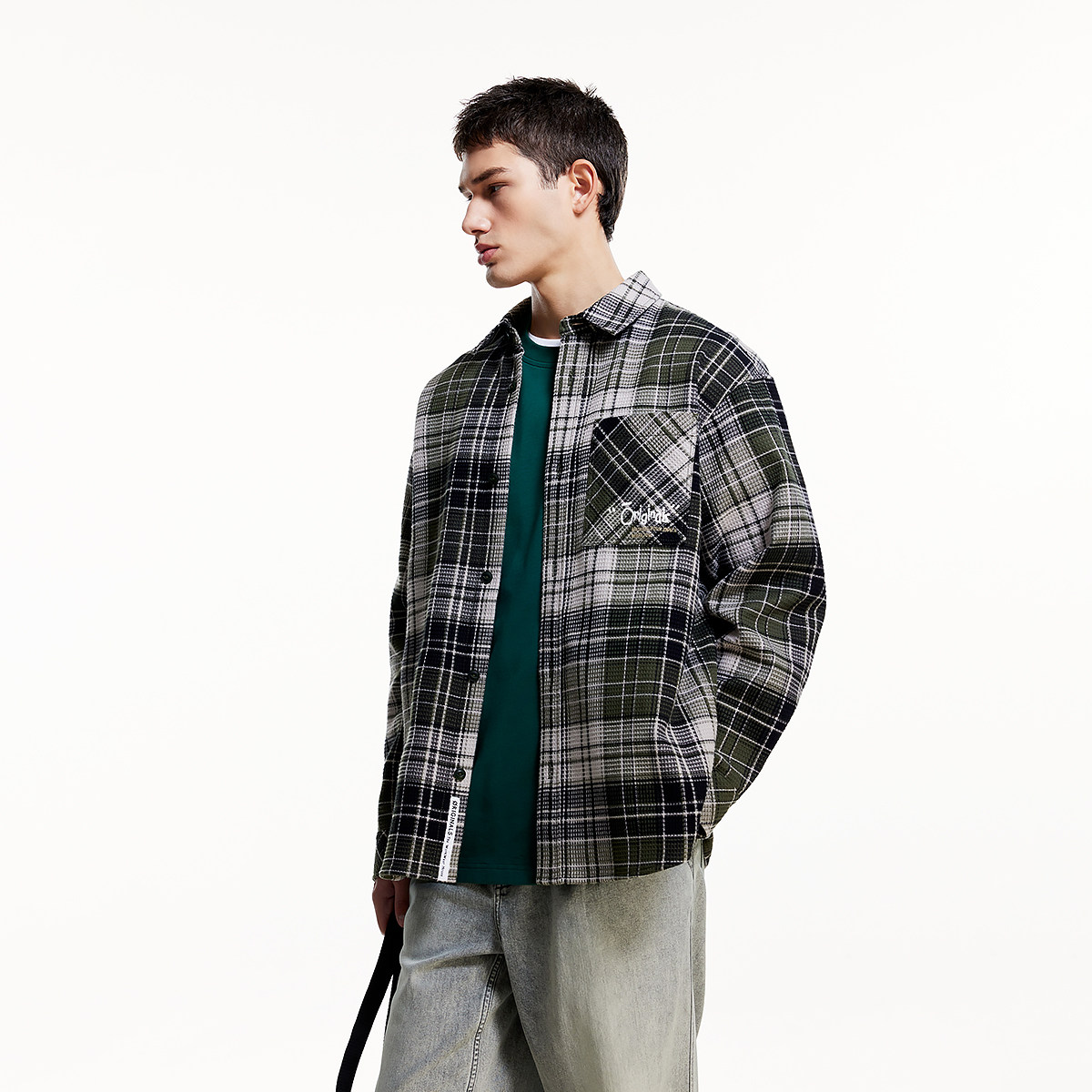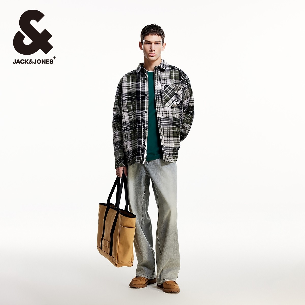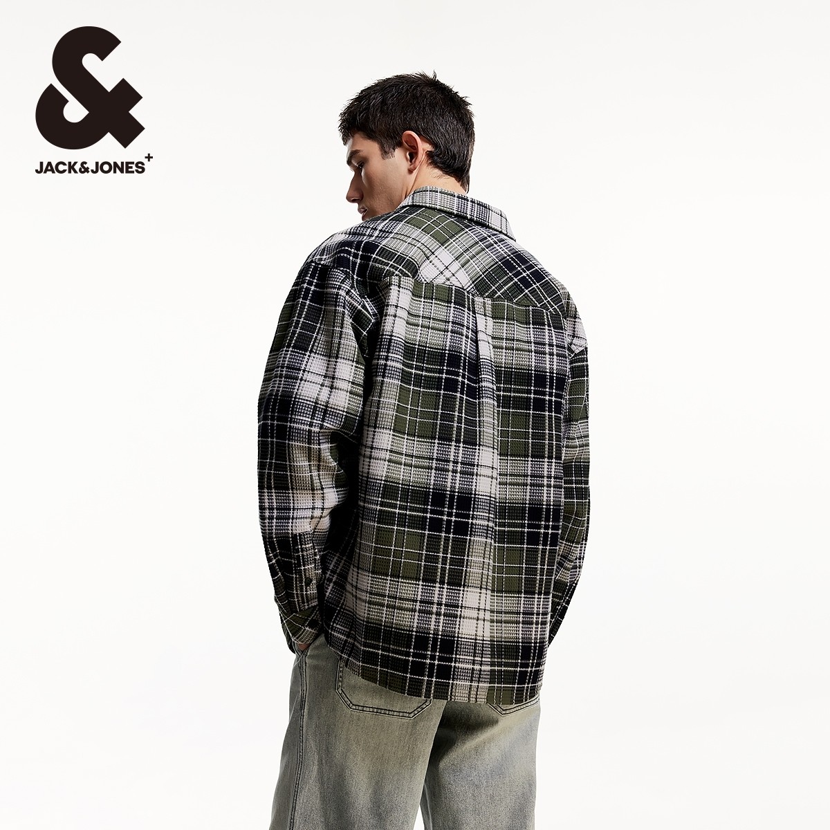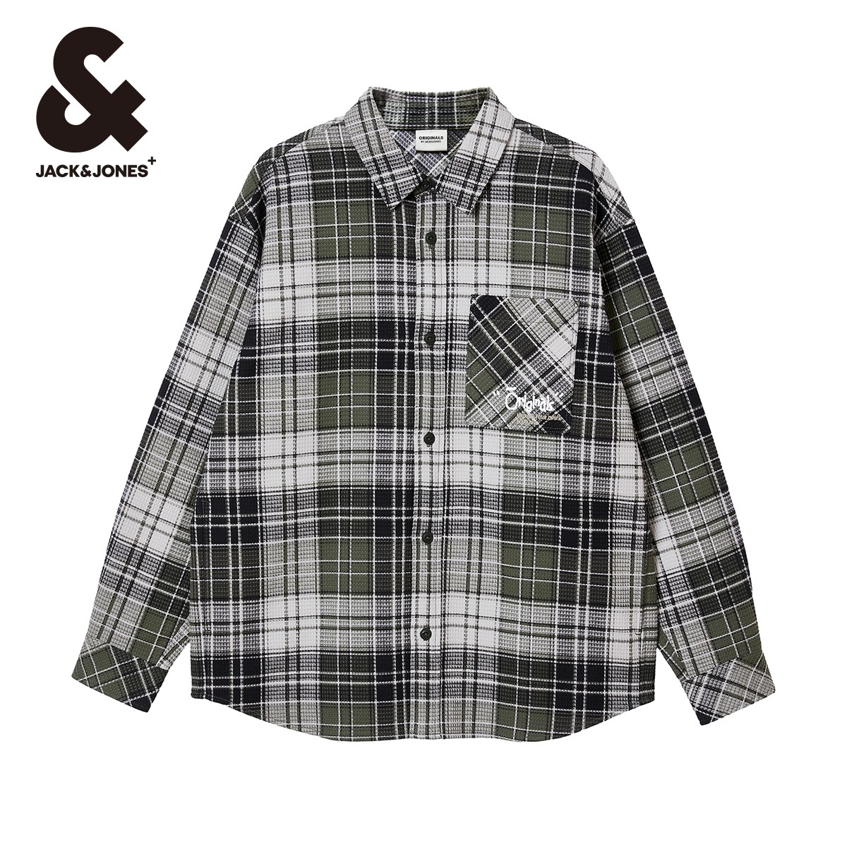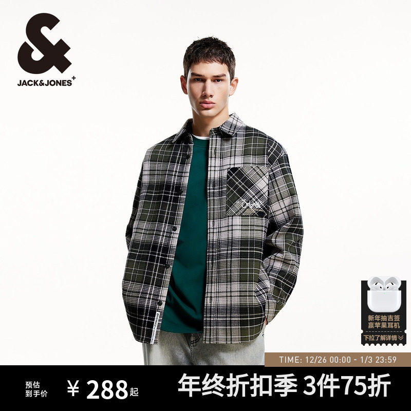 杰克琼斯男装秋季新款休闲复古纯棉字母刺绣格纹宽松工装长袖衬衫