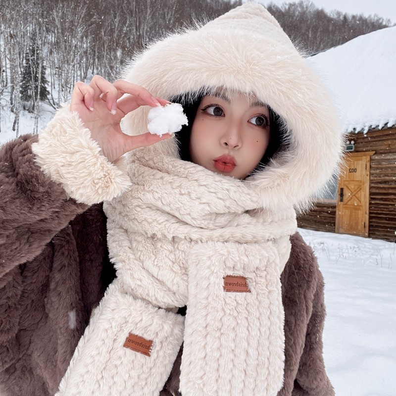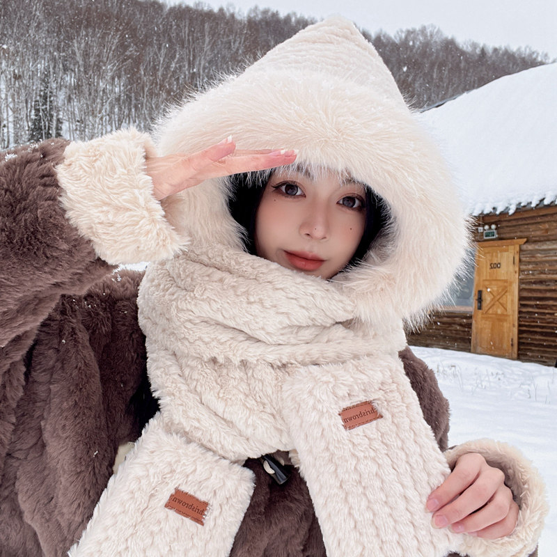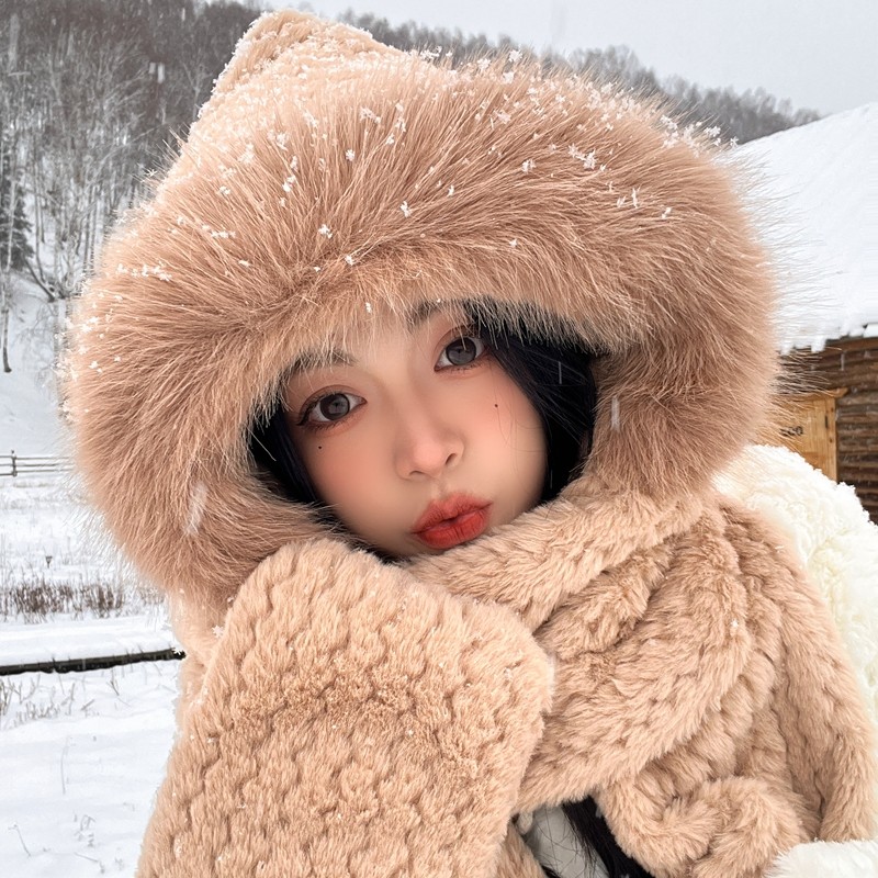 2025新款帽子围巾一体女秋冬季毛绒连帽手套保暖东北防风围脖秋冬