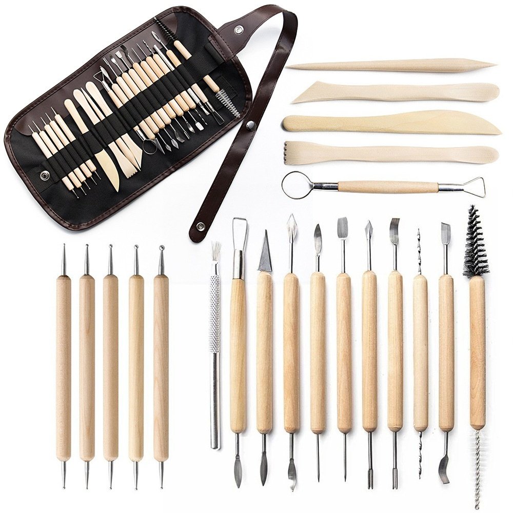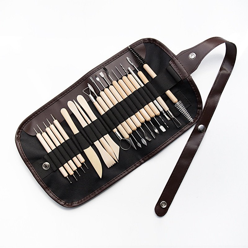 跨境陶艺工具21件套装收纳腰包粘土软陶泥塑蕾丝雕刻刀木质点钻笔