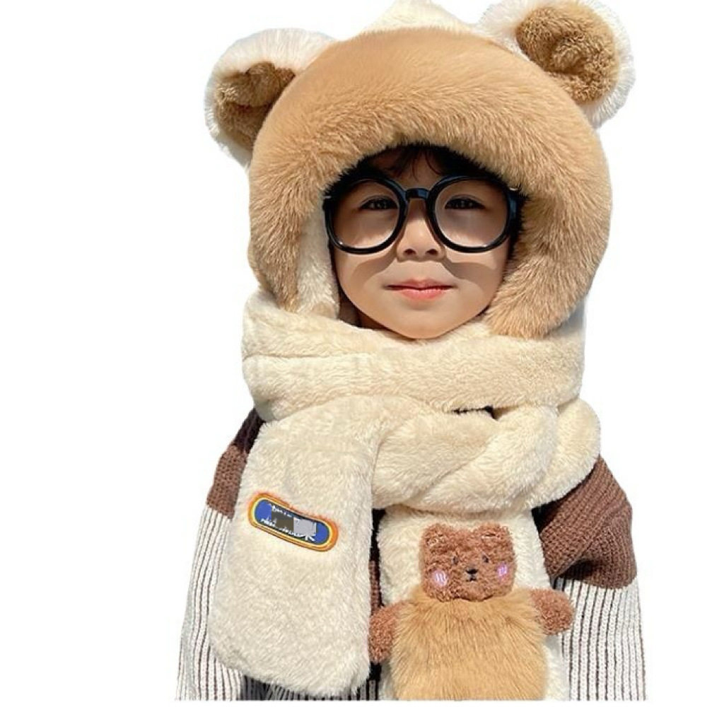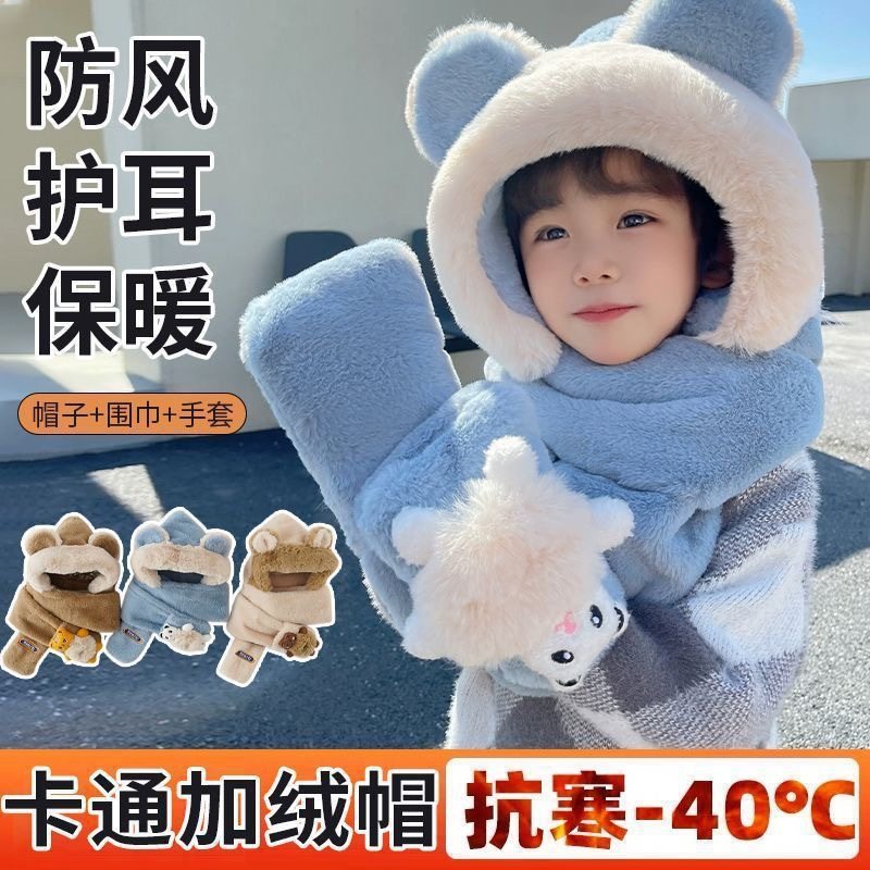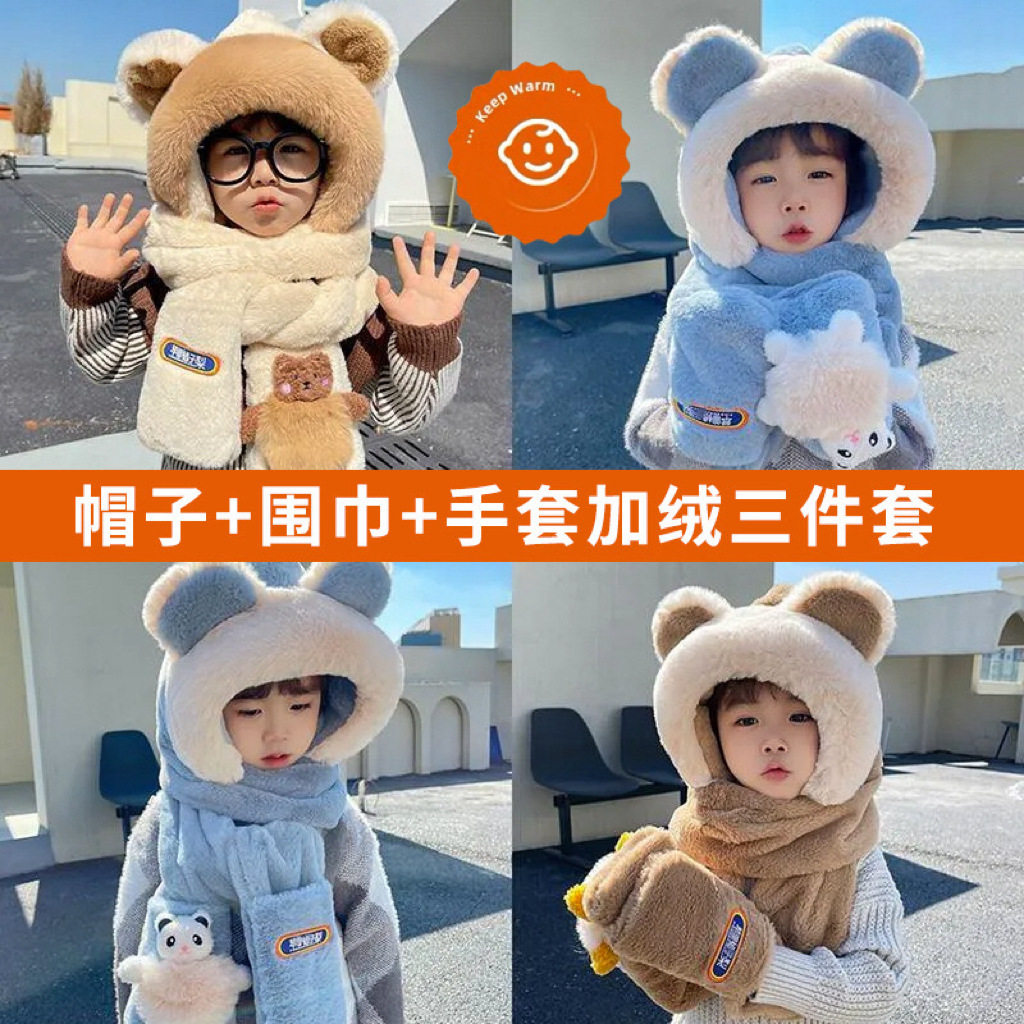 冬季儿童帽子三件套宝宝围脖手套一体护耳帽男女童加厚东北连指