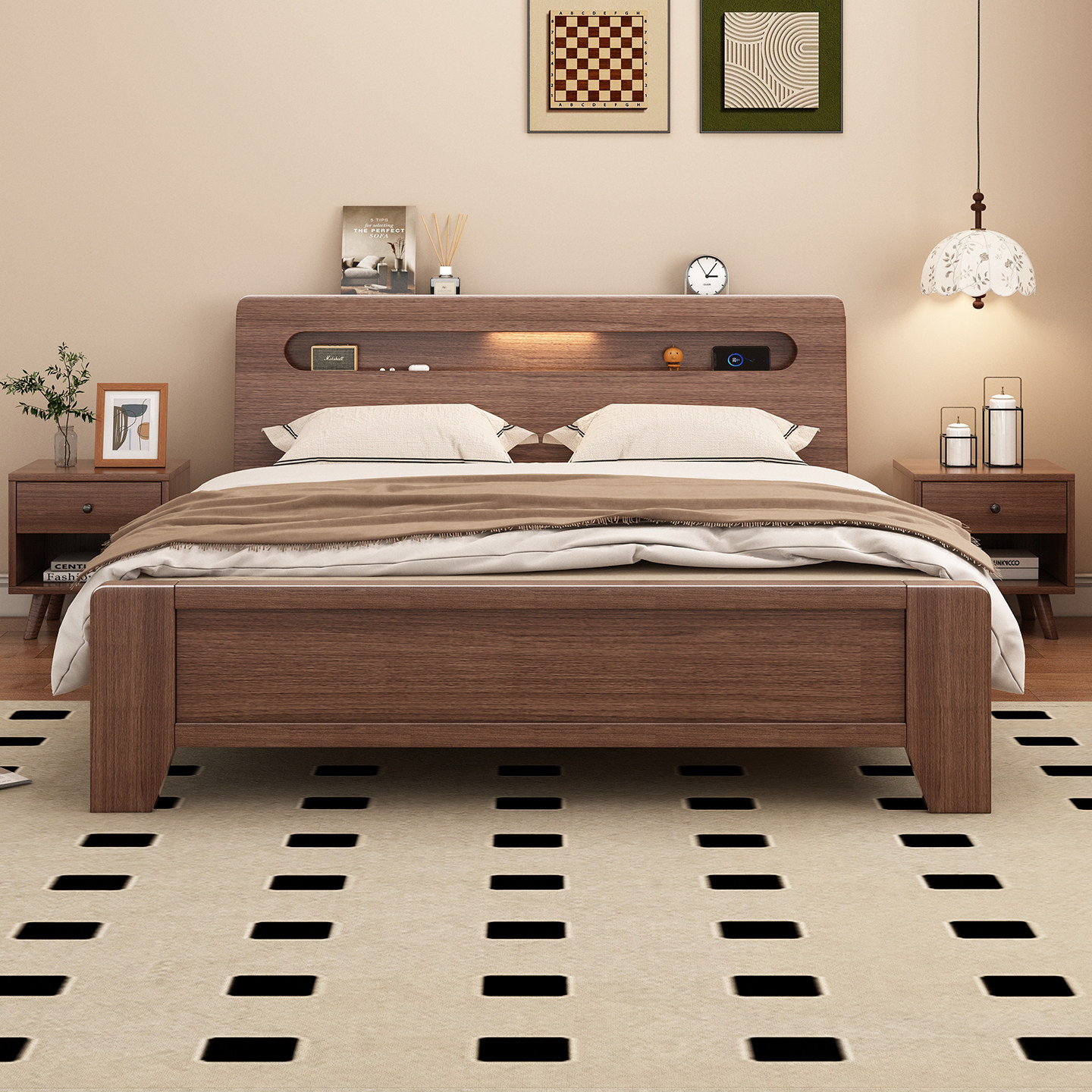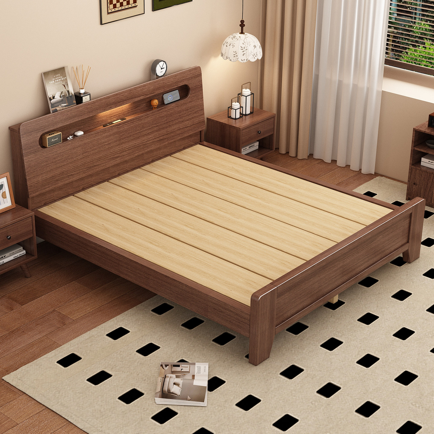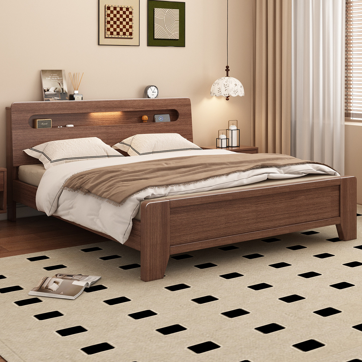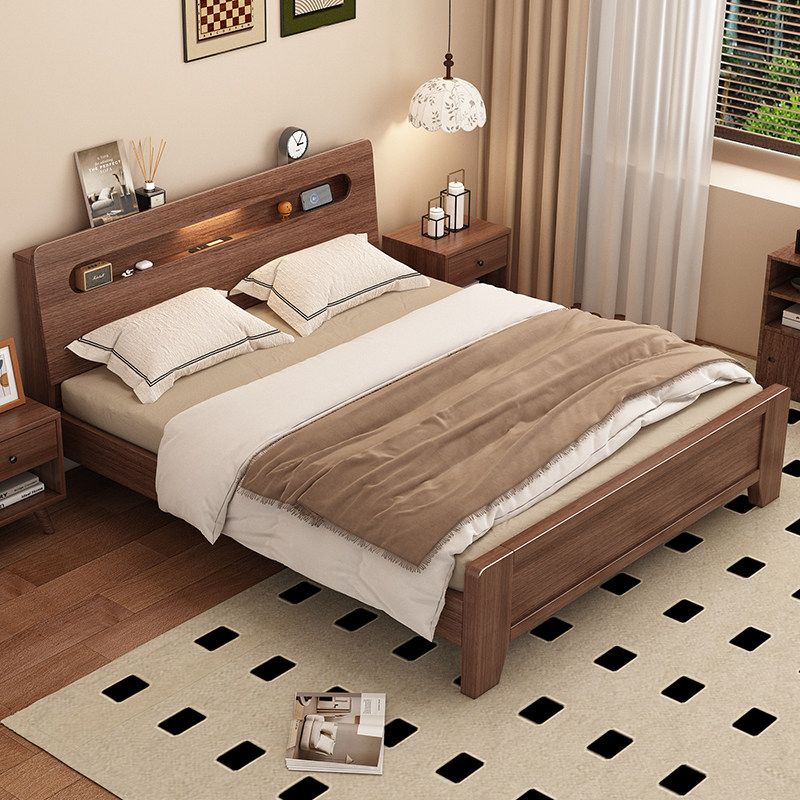 实木床现代简约胡桃木主卧1.5米双人床1.8米主卧轻奢婚房双人床