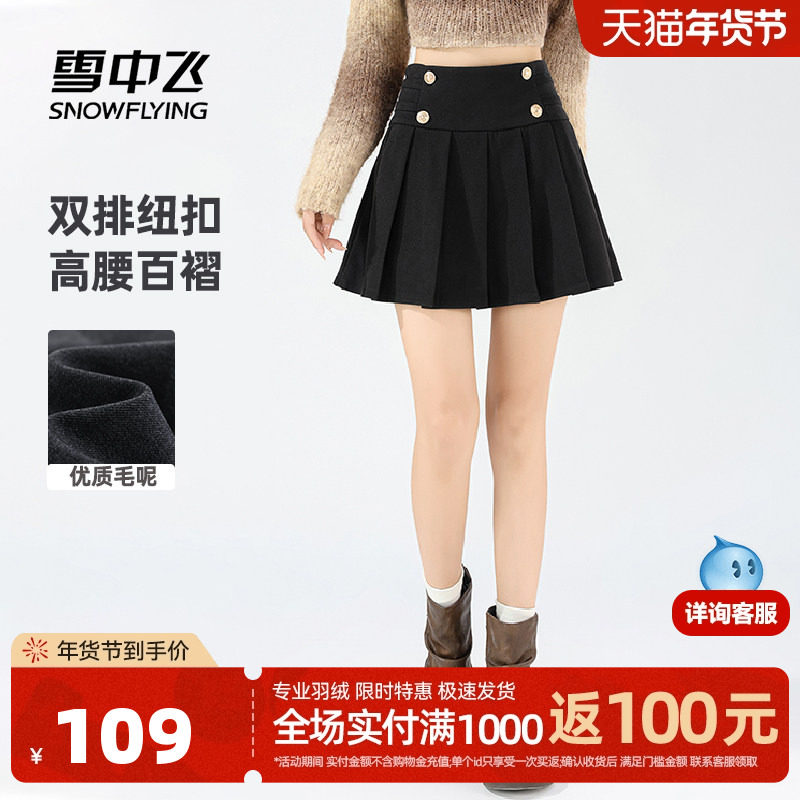 雪中飞毛呢百褶裙女秋冬2026新款双排扣设计感高腰显瘦女士短裙PC