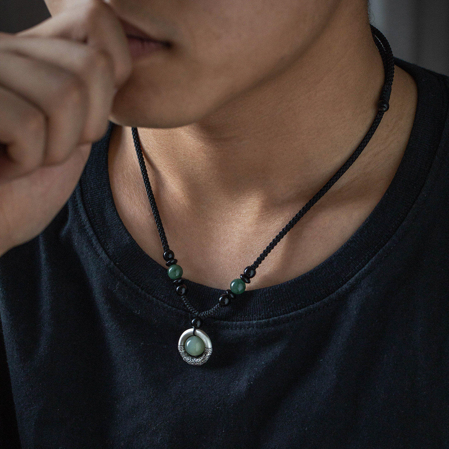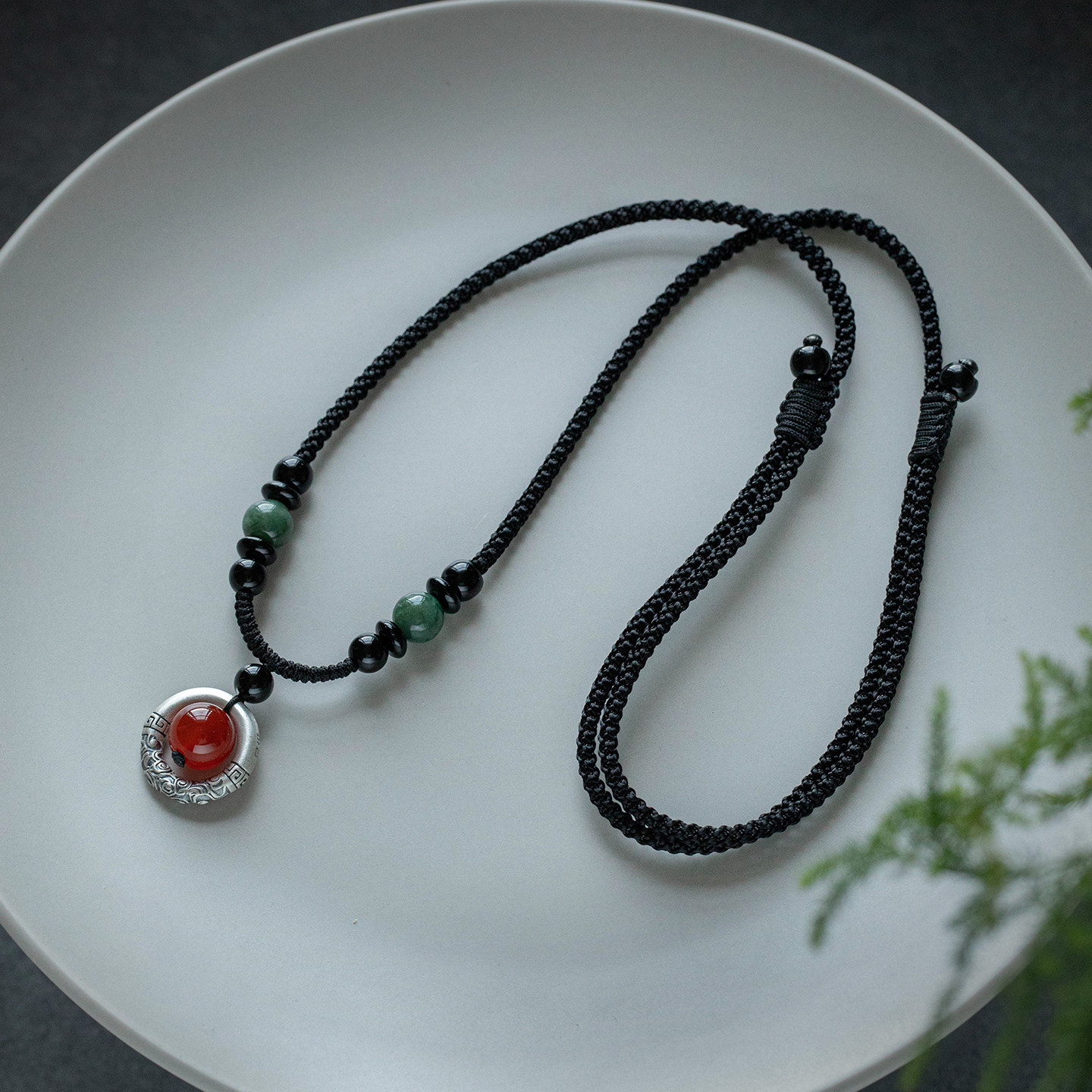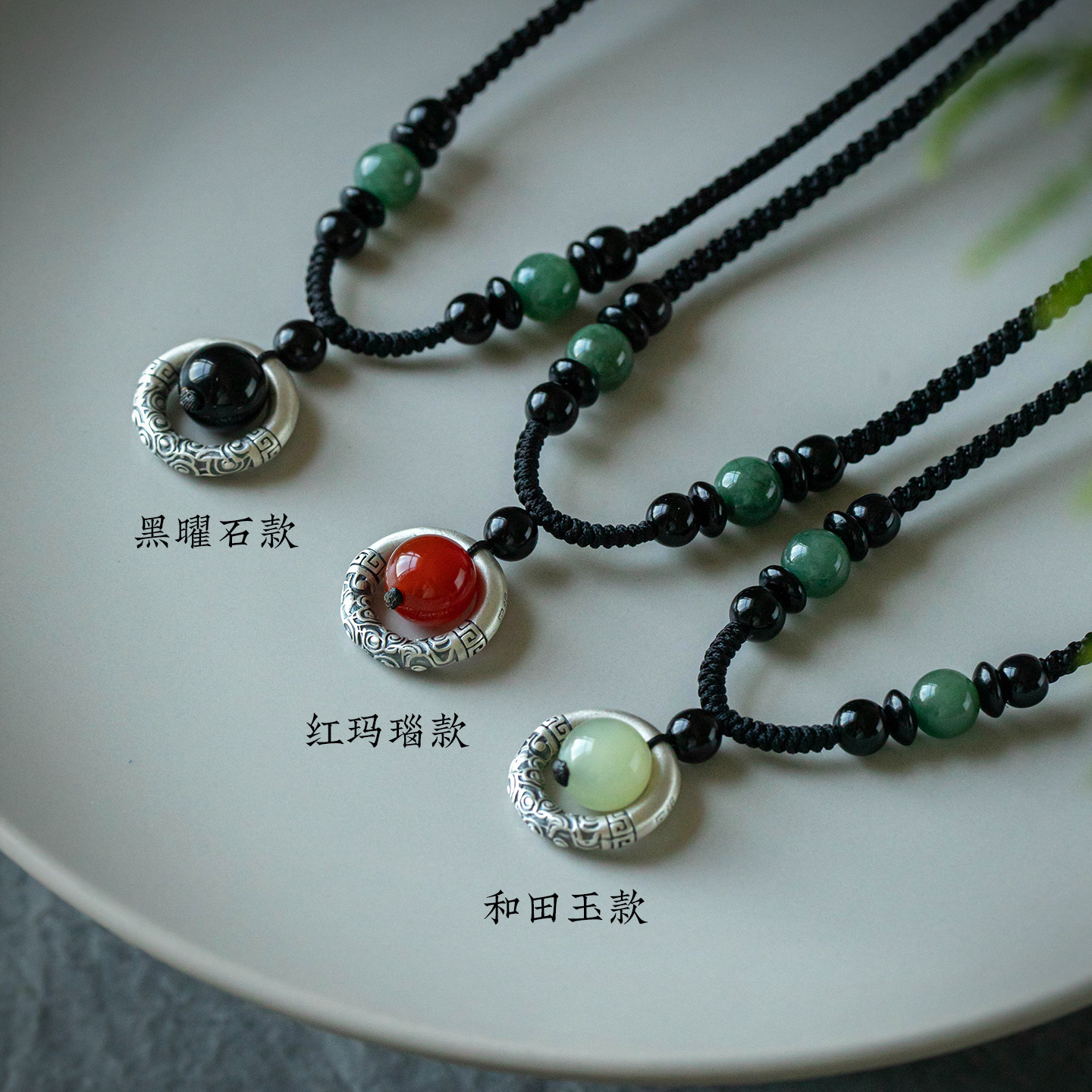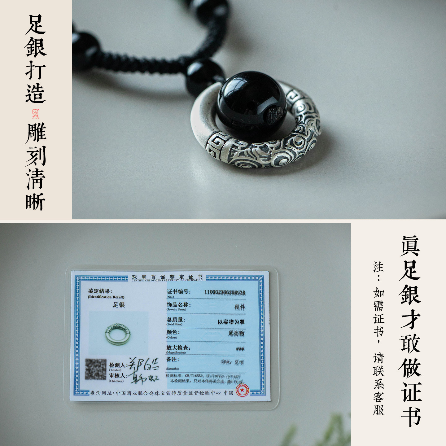 大善堂黑曜石圆珠吊坠足银平安扣项链高档精致挂坠可调节礼物情侣