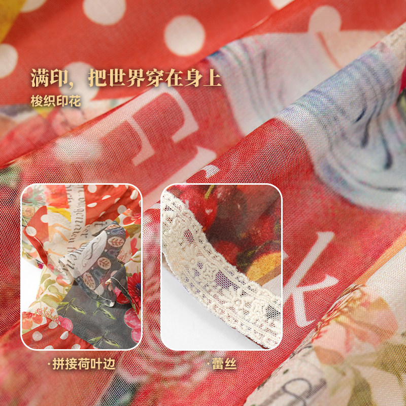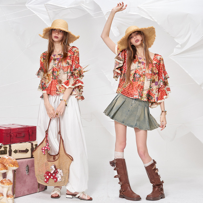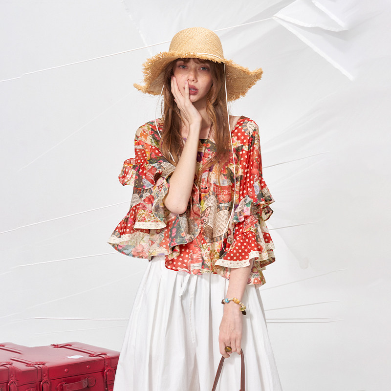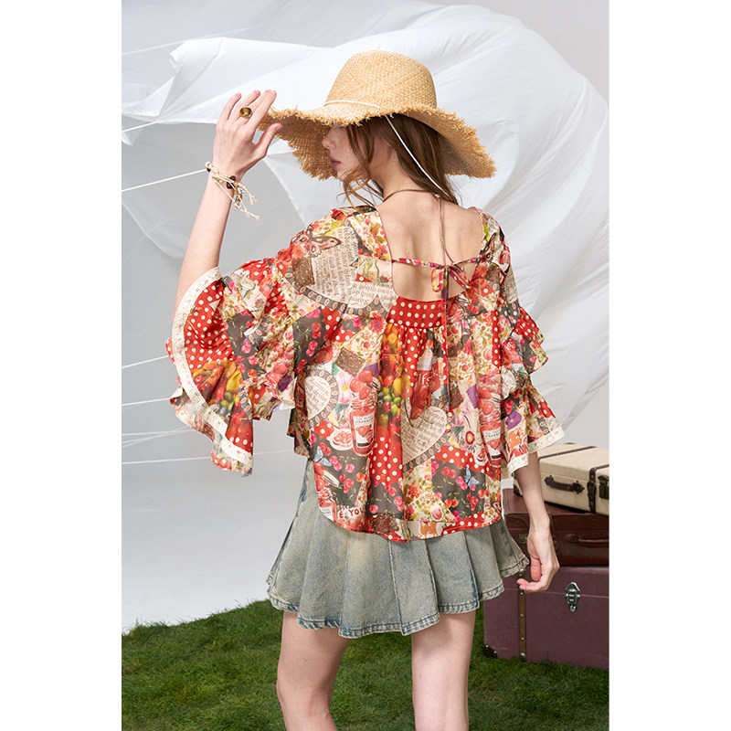 妖精的口袋荷叶边满印甜美度假风蕾丝衫女2026夏新款绝美漂亮小衫