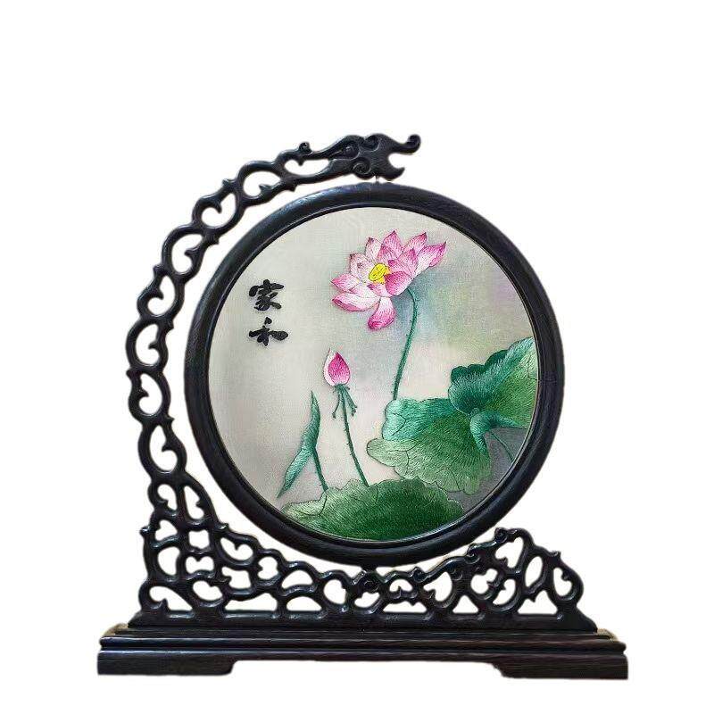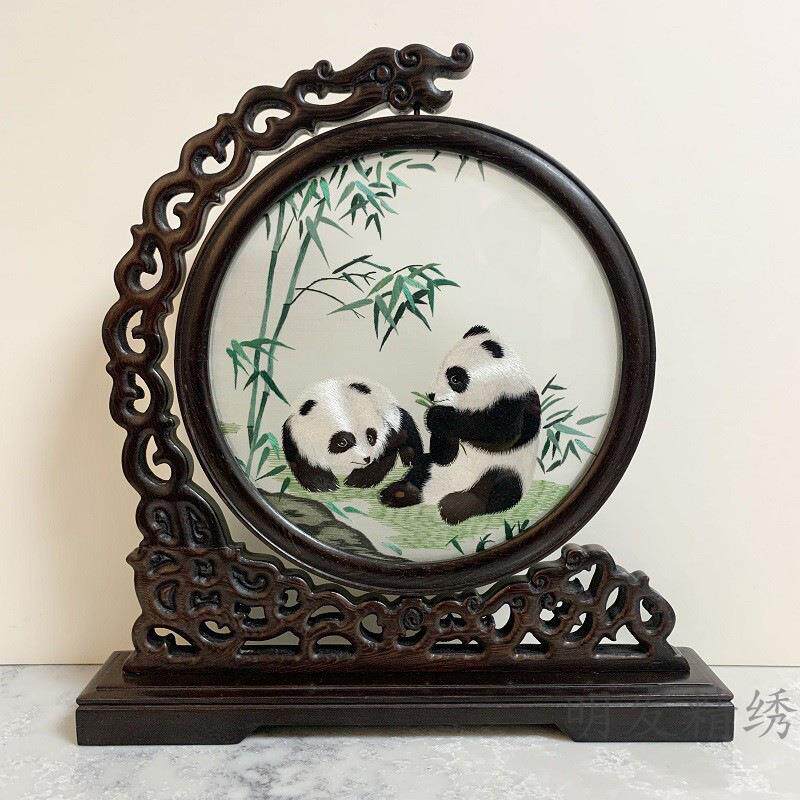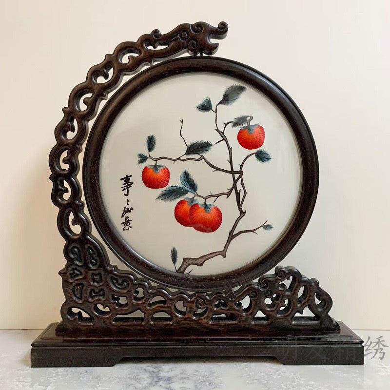 苏州特产手工苏绣刺绣成品摆件台屏双面绣实木桌面整体橱柜出国装