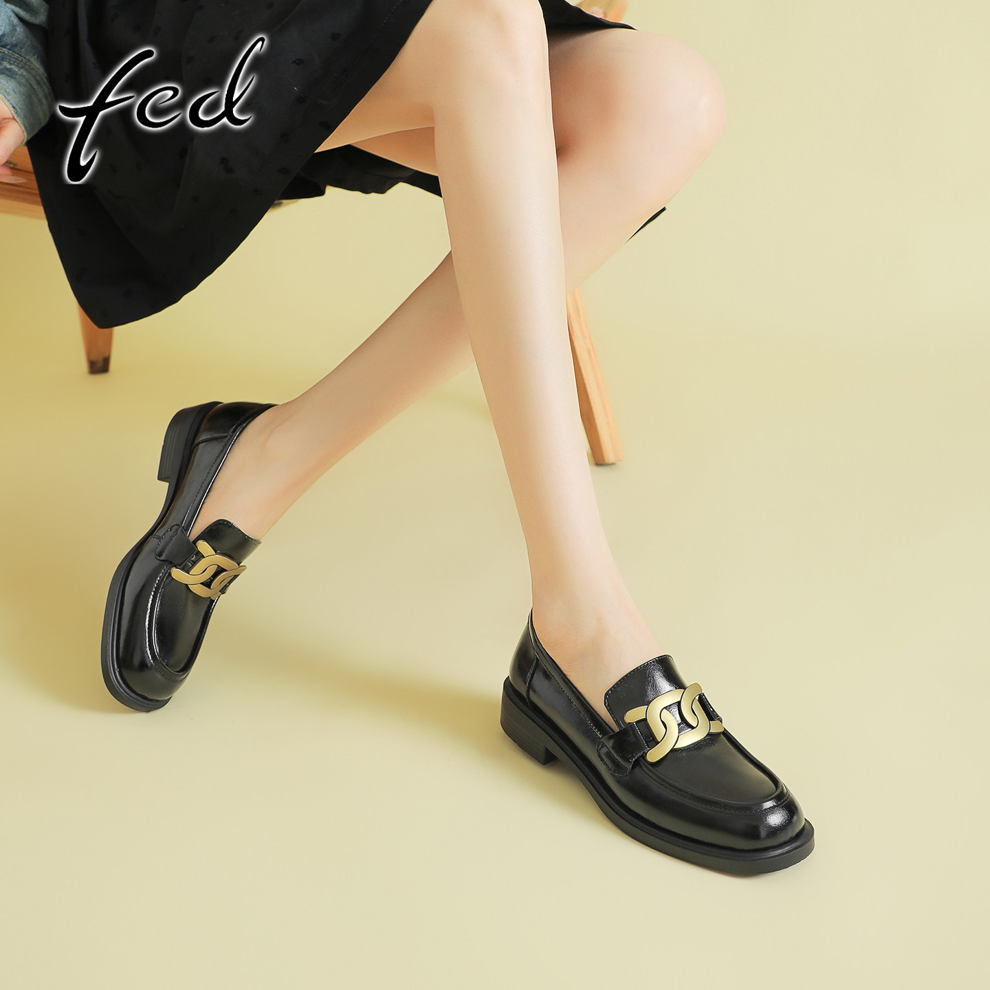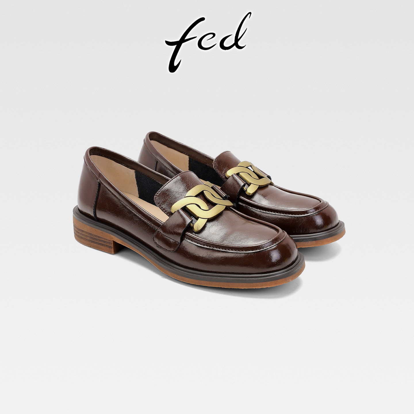 fed一脚蹬真皮粗跟乐福鞋女英伦风复古金属扣小皮鞋中跟圆头单鞋