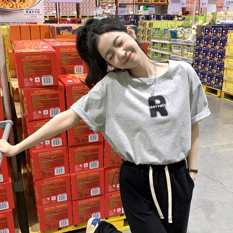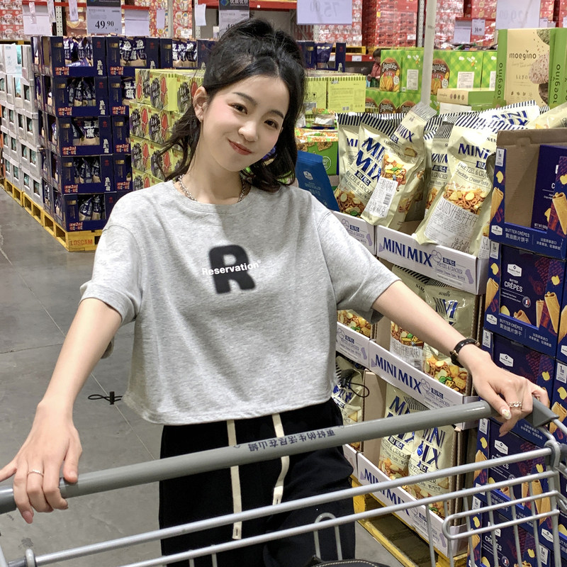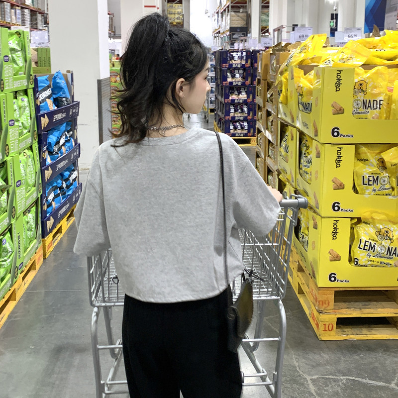 唐狮圆领短袖女T恤衫灰色夏季收腰短款港味chic上衣小众短袖T恤
