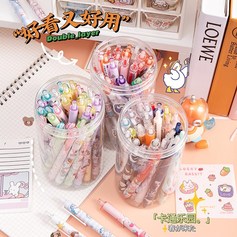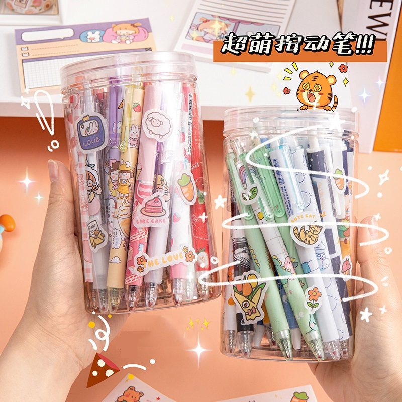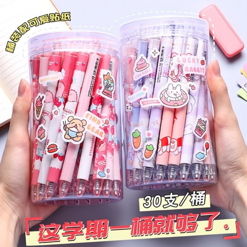 按动中性笔30支桶装卡通高颜值圆珠笔小学生专用速干0.5水性笔初中女生好看的可爱水笔芯按压签字笔批发一桶
