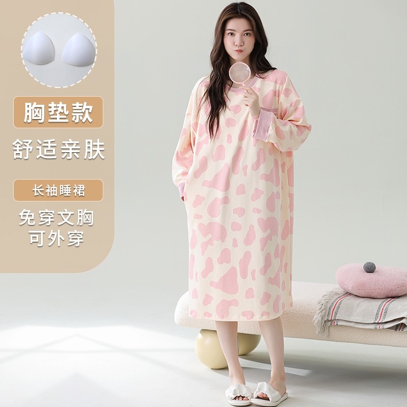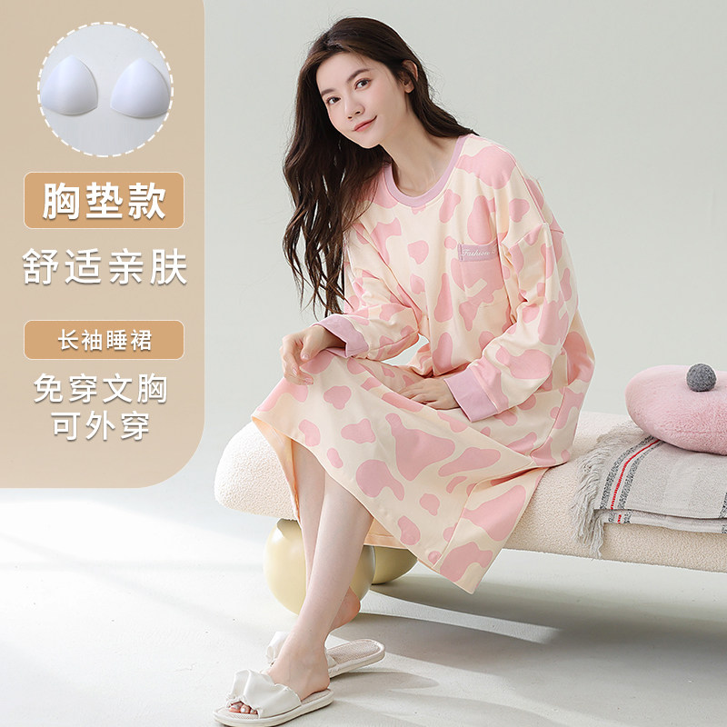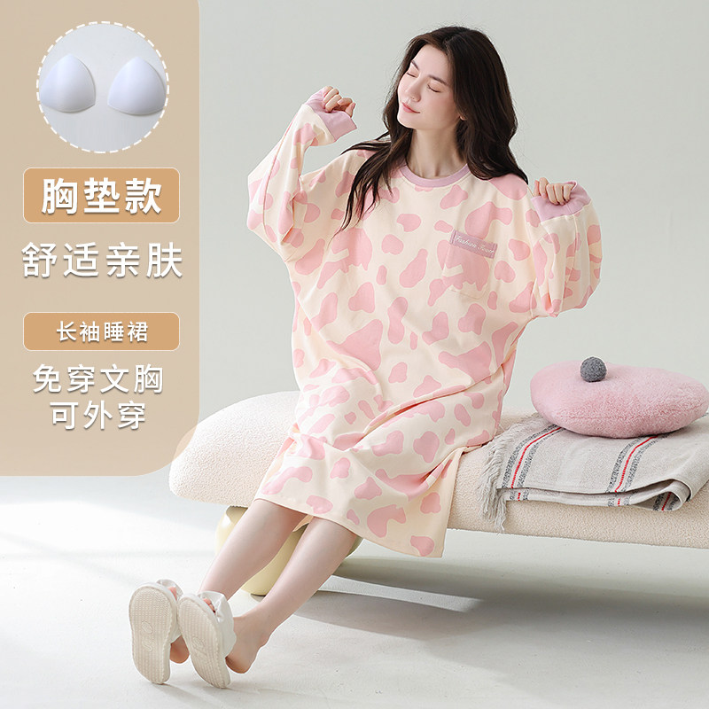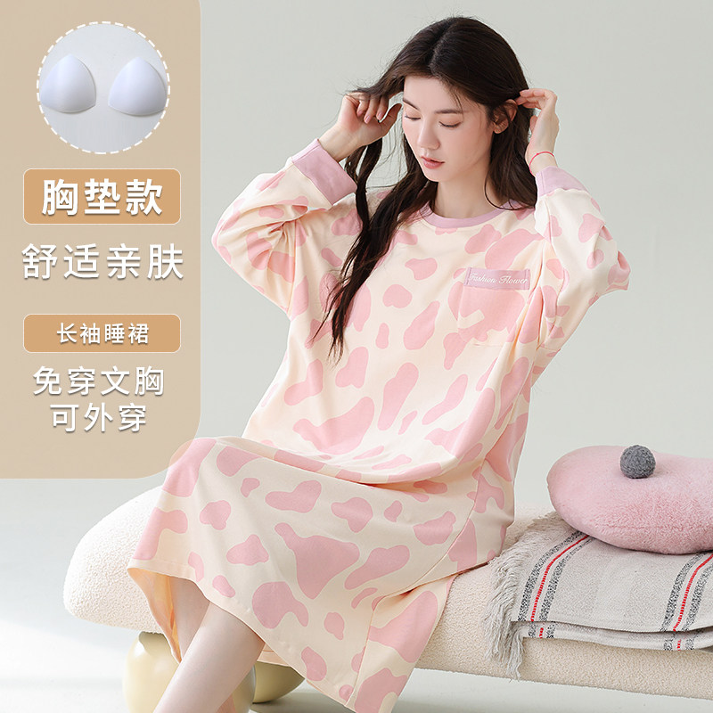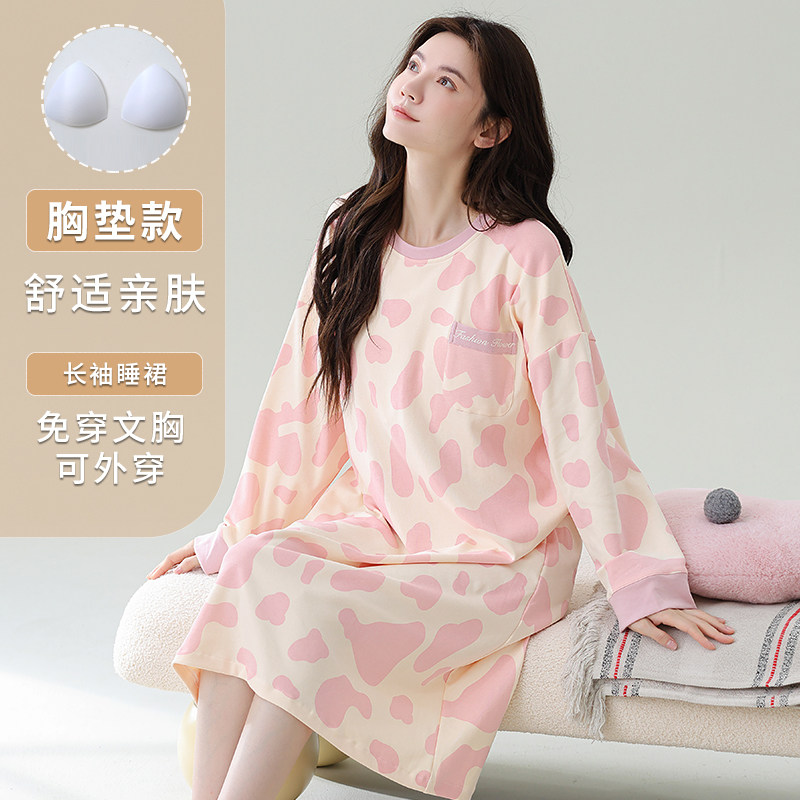 2025秋冬新款带胸垫睡裙长袖高级感圆领套头中长款可外穿睡衣裙