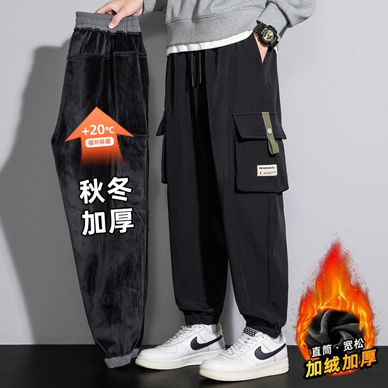 加绒工装裤男士秋冬季宽松加肥加大码宽松束脚裤加厚保暖休闲裤子