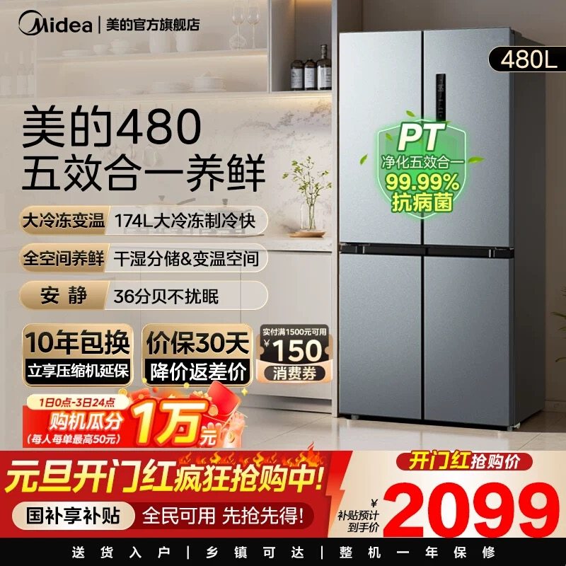 美的480升十字对开双开四门大容量一级风冷无霜嵌入式家用冰箱