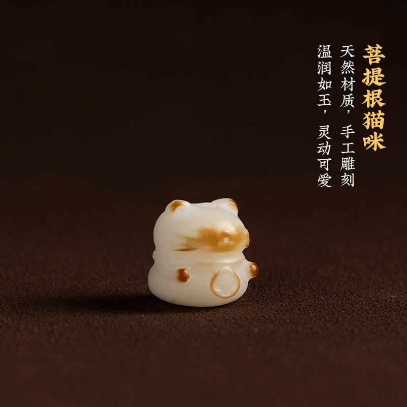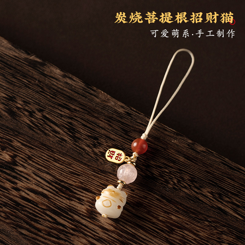 加噜天然白菩提根炭烧招财猫咪手机挂绳小清新可爱猫咪手机链精致女高档钥匙扣南红粉晶挂件情侣挂饰好运吊坠