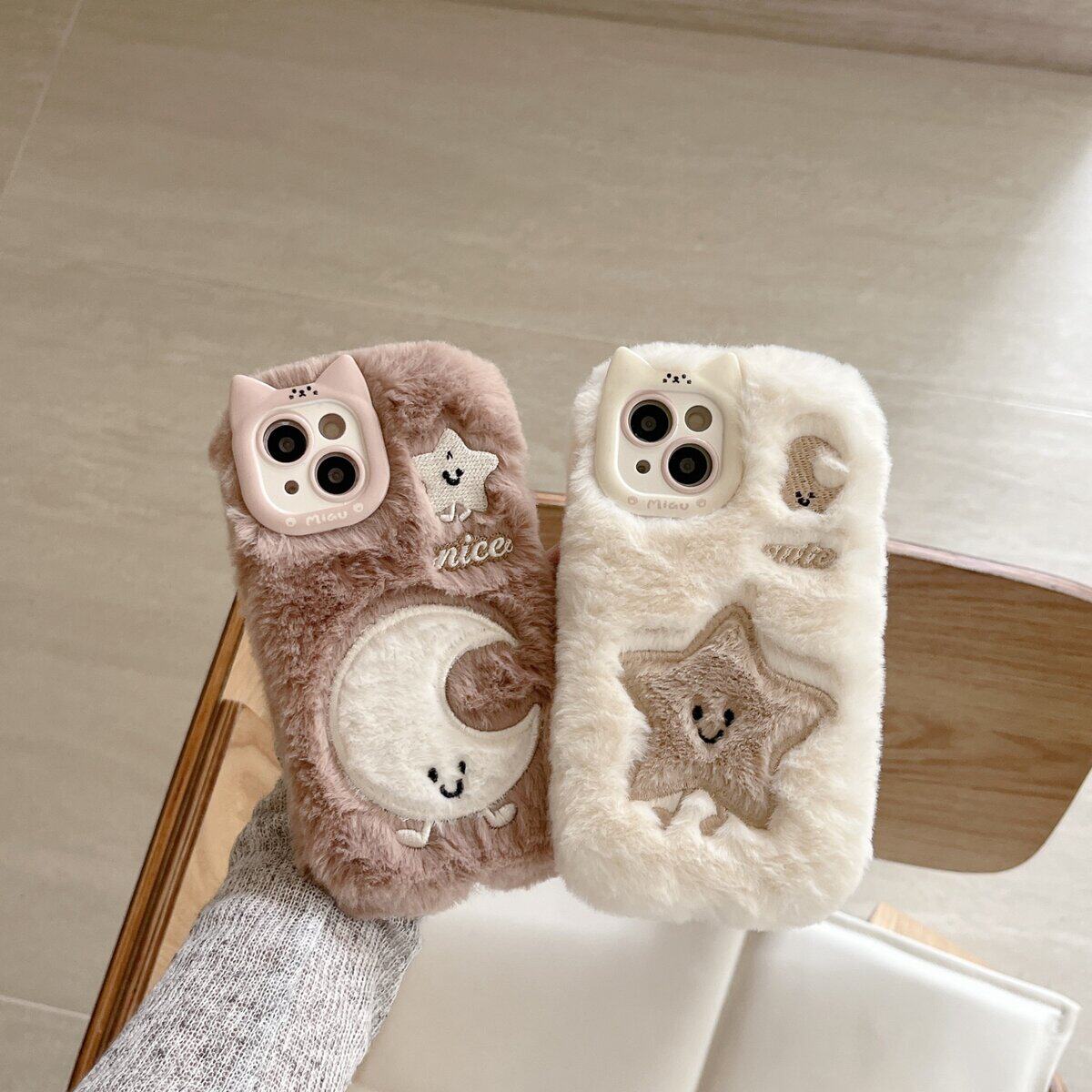 日韩猫耳简约刺绣星星月亮毛绒壳冬天保暖适用于苹果17时尚手机壳13新款16promax可爱手机保护壳15plus壳14