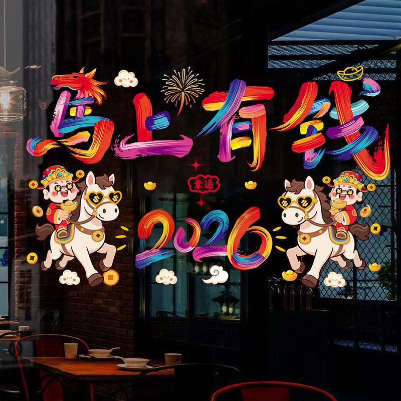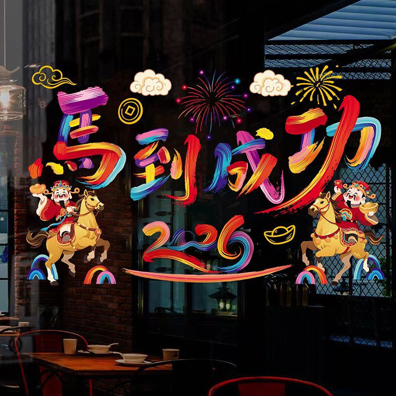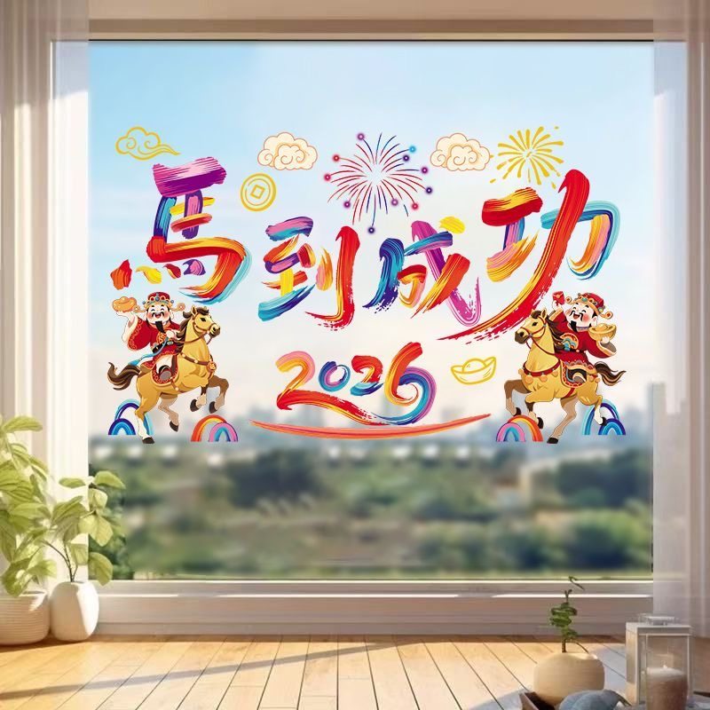 新年快乐2026元旦马年装饰玻璃贴纸春节过年布置窗花静电贴画窗户