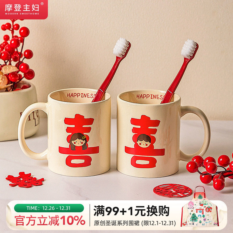 摩登主妇漱口杯牙刷杯结婚一对红色陶瓷洗漱杯套装新婚礼物情侣杯