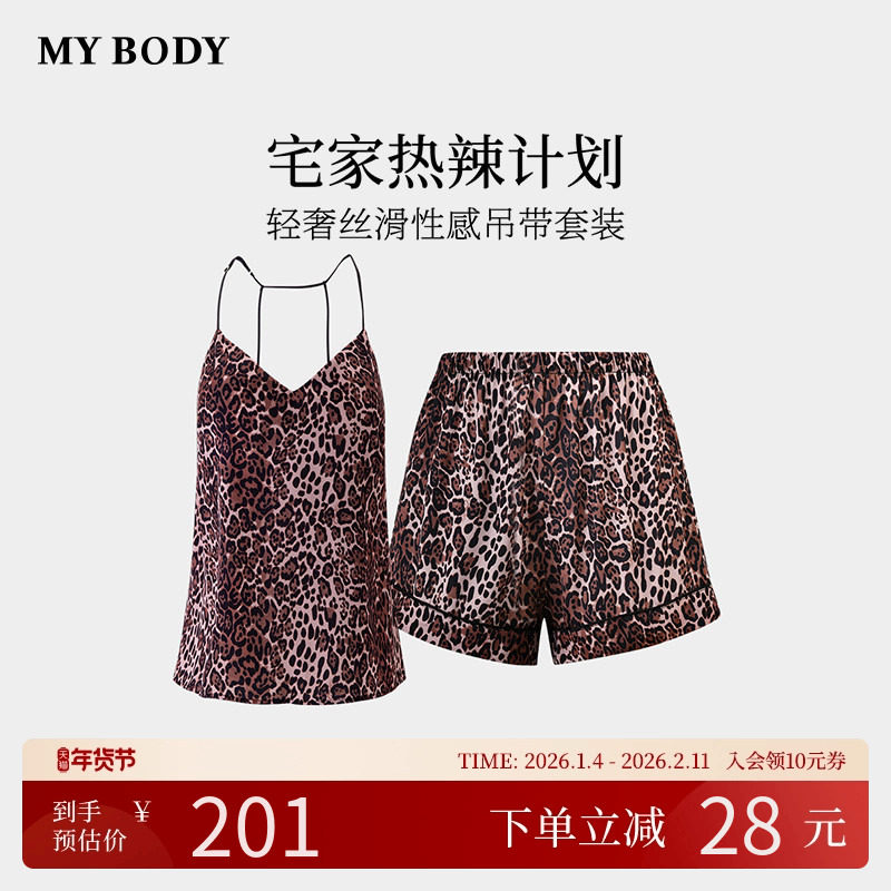 商场同款MYBODY吊带睡衣套装女性感豹纹带胸垫缎面家居服两件套