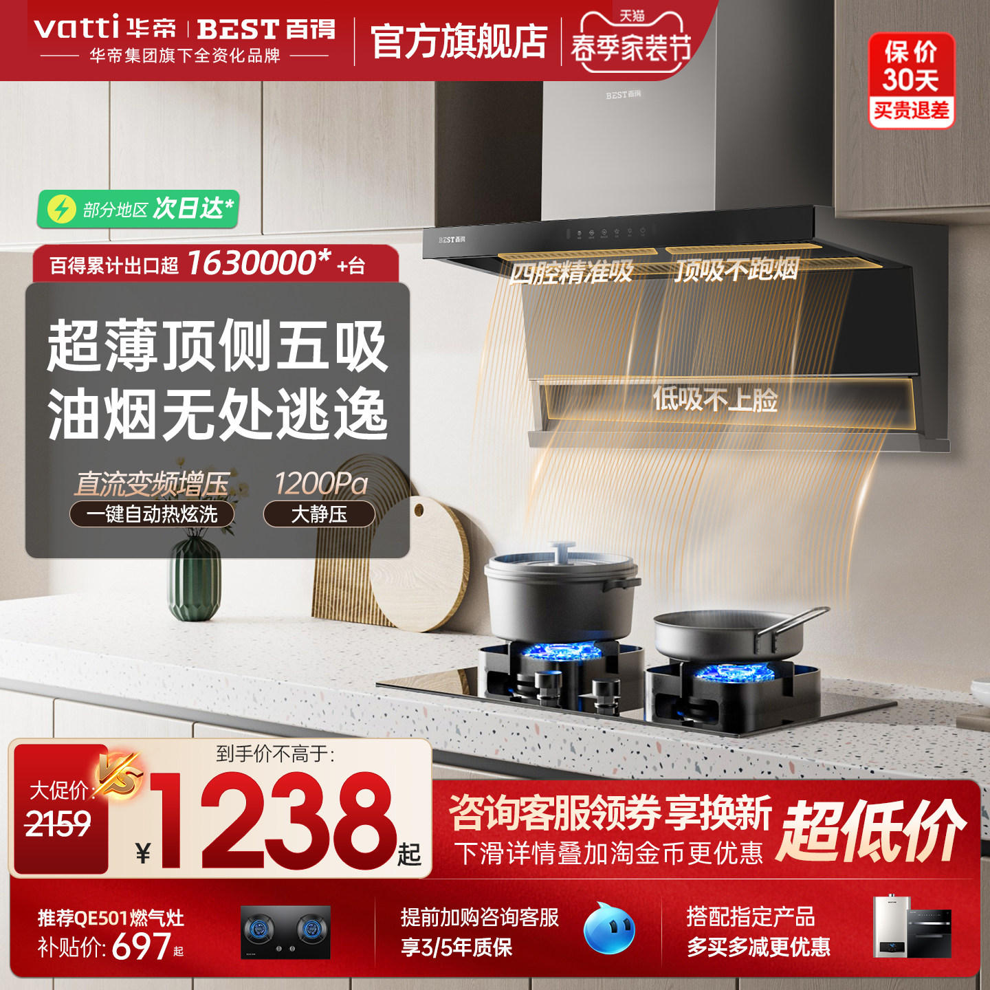 百得顶侧双吸油烟机灶套装自清洗变频大吸力脱排抽油烟机家用厨房