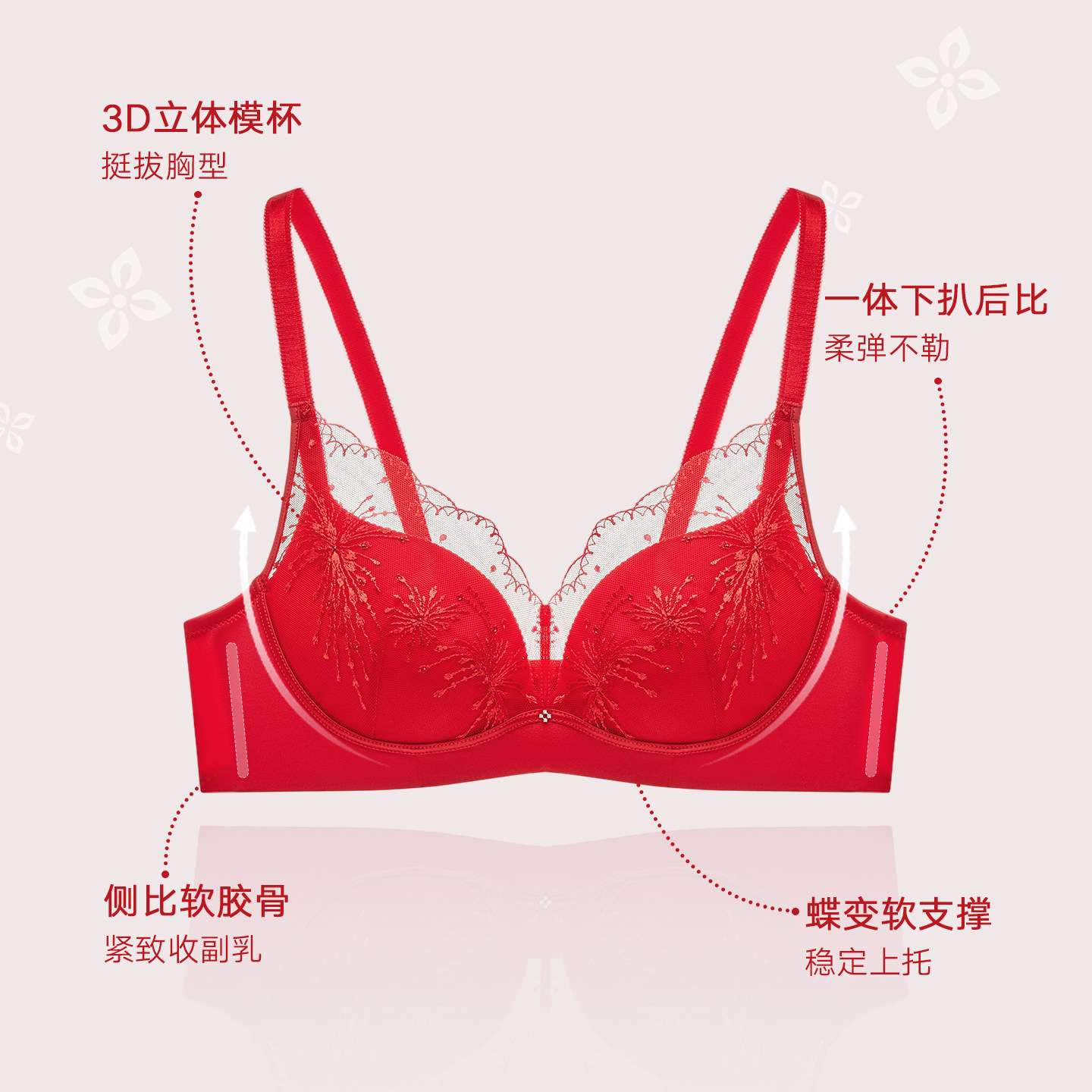 曼妮芬女士舒适无钢圈内衣蕾丝文胸本命年红色马年小胸聚拢胸罩