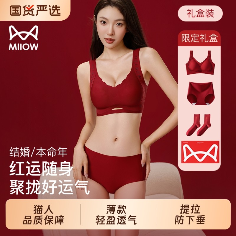 猫人红色本命年内衣女小胸聚拢新娘结婚无痕2026马年文胸内裤套装