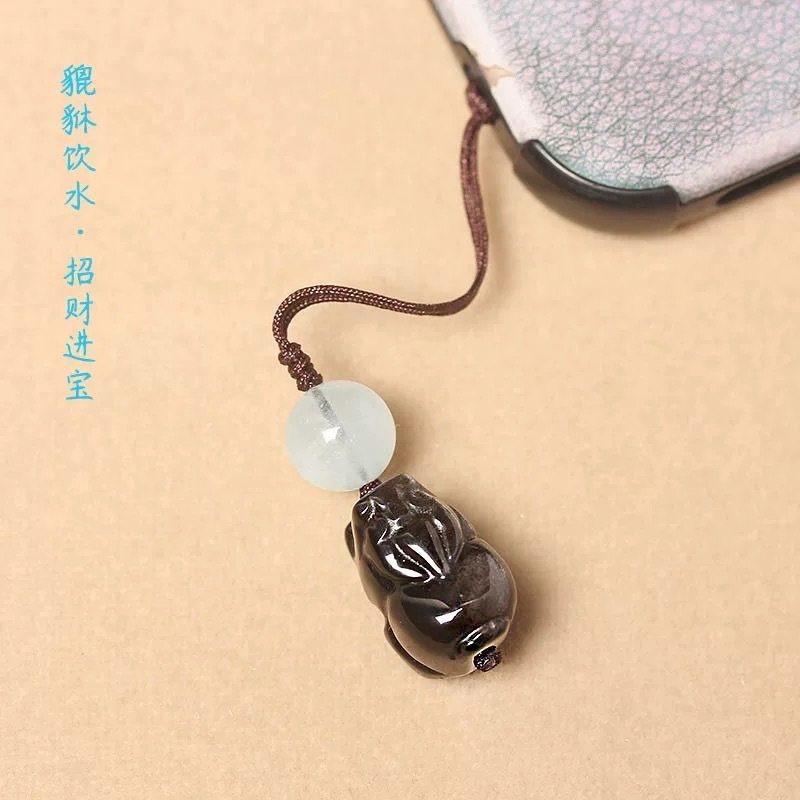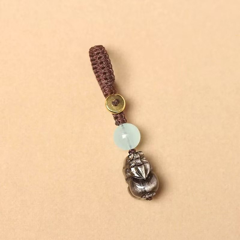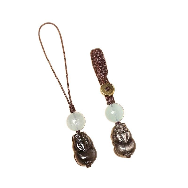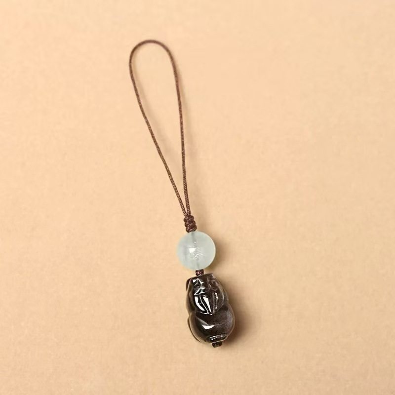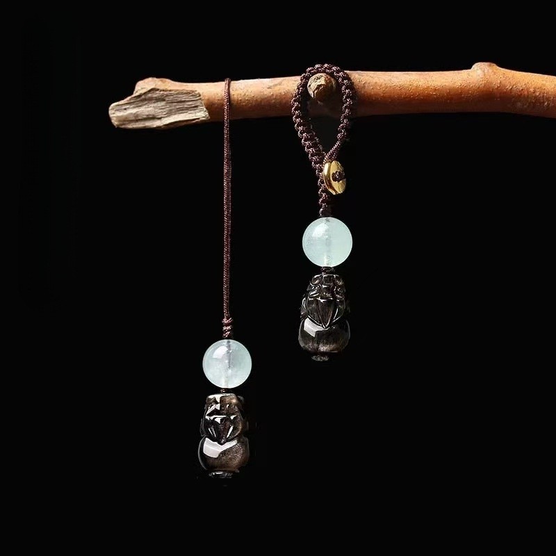 天然银曜石蓝色圆珠大肚貔貅钥匙扣手机链情侣手机车挂件男女同款