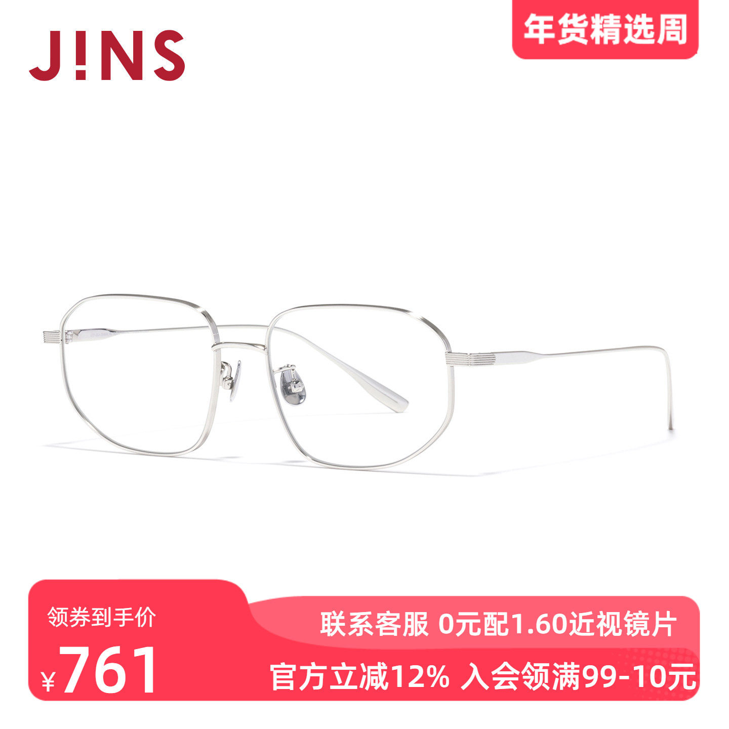 JINS睛姿近视眼镜钛金属轻量多边形框可加配防蓝光镜片UTF25A254