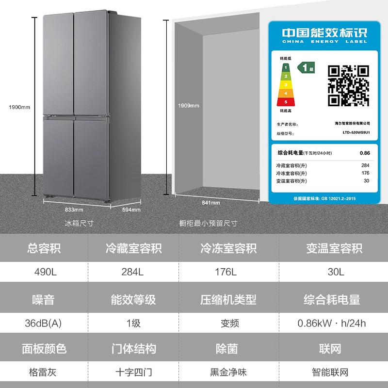 以旧换新补贴海尔539L十字双开四门一级能效无霜电冰箱家用大容量