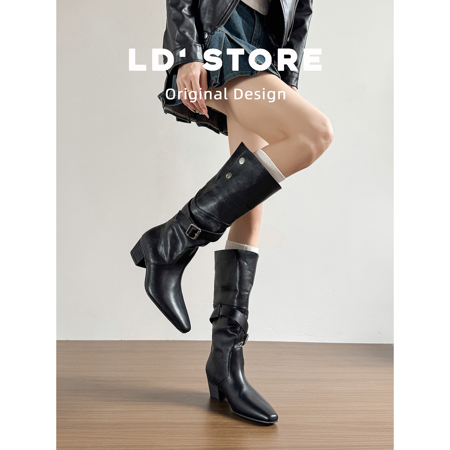 真皮~骄屿复古皮带扣粗跟长筒靴不过膝显瘦骑士靴尖头褶皱堆堆靴