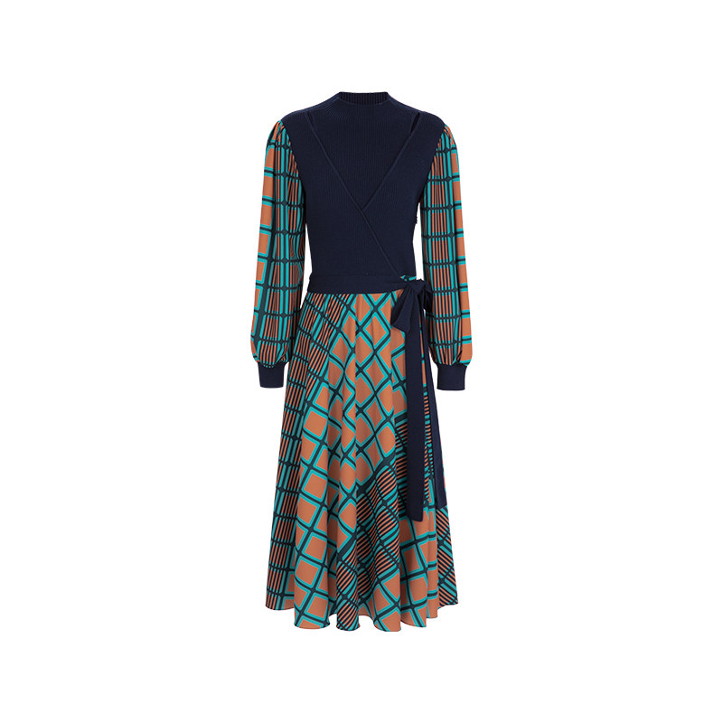 MARYLING玛俪琳秋冬新品蓝绿格子中长裙小立领针梭拼接连衣裙