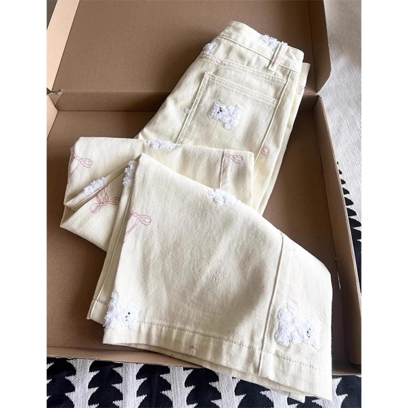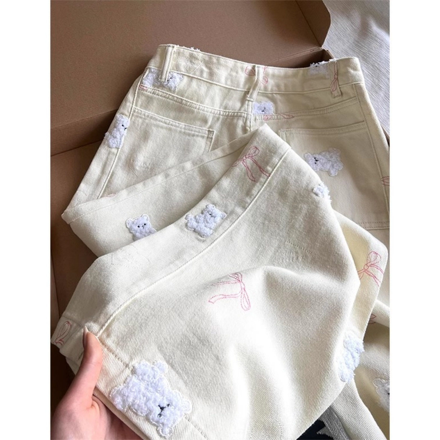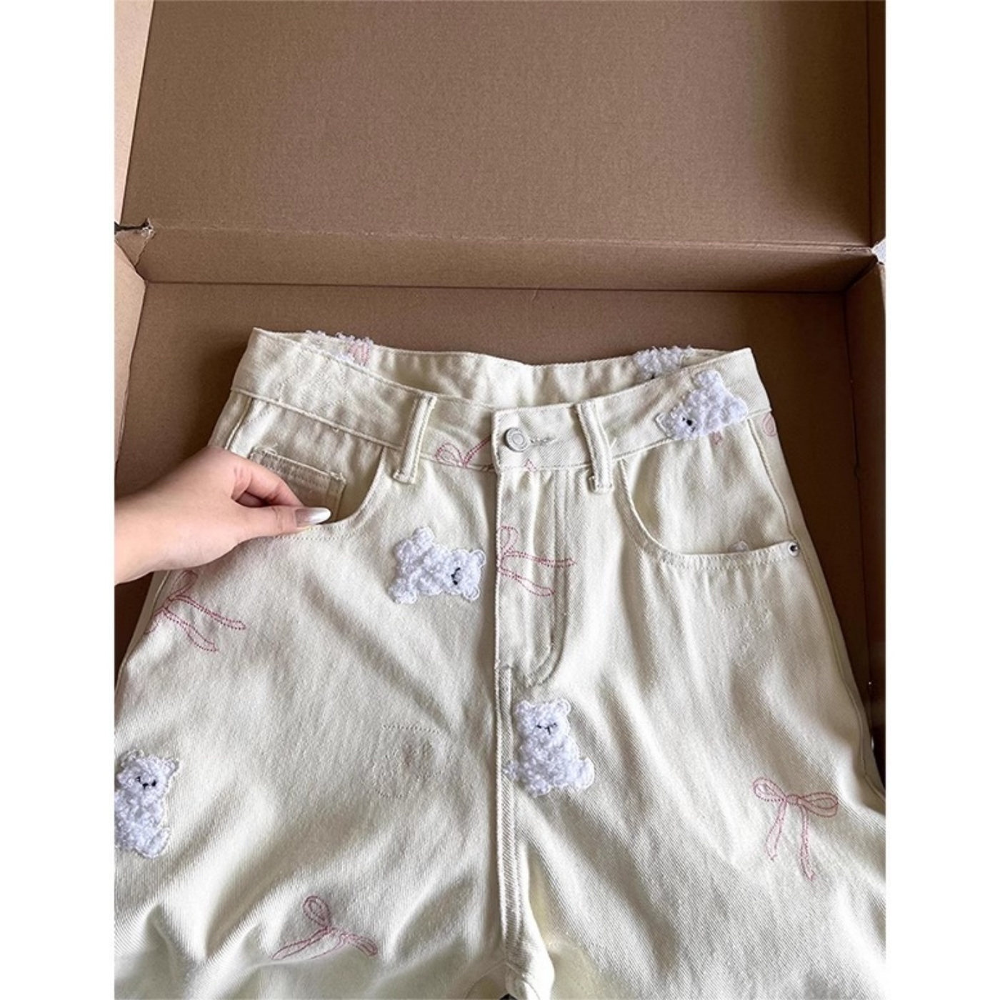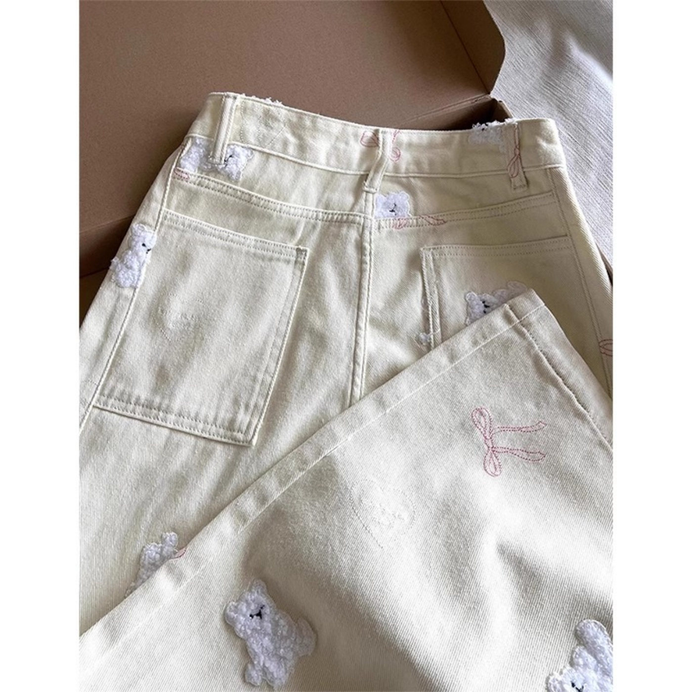 大码少女风设计感小熊贴绣牛仔裤女2025秋冬加绒宽松显瘦阔腿长裤