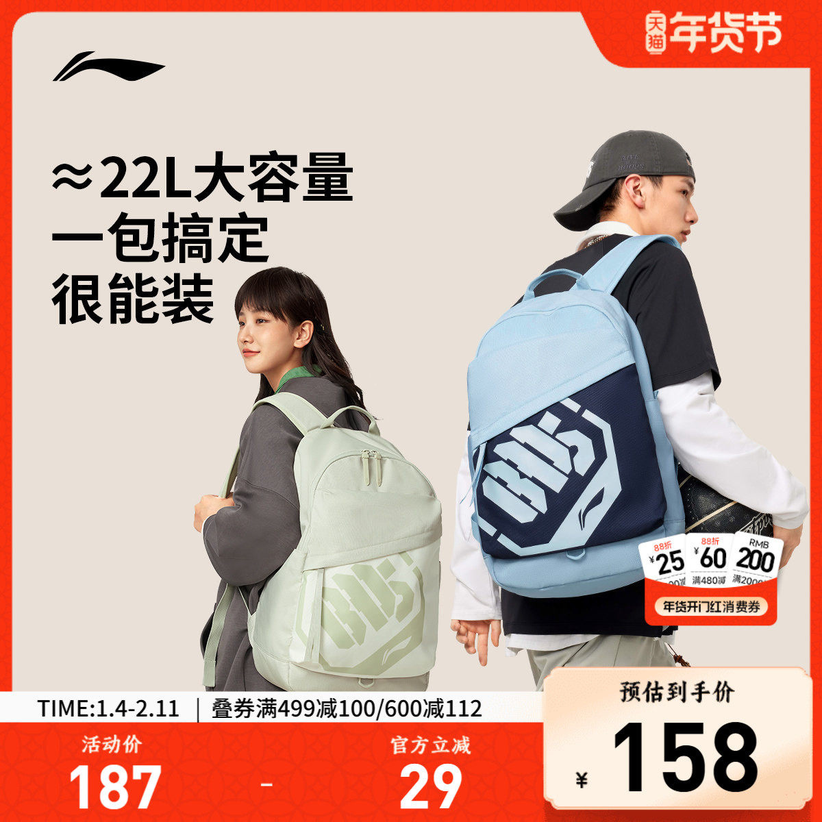 李宁反伍BADFIVE双肩包男包女包新款背包学生书包运动包