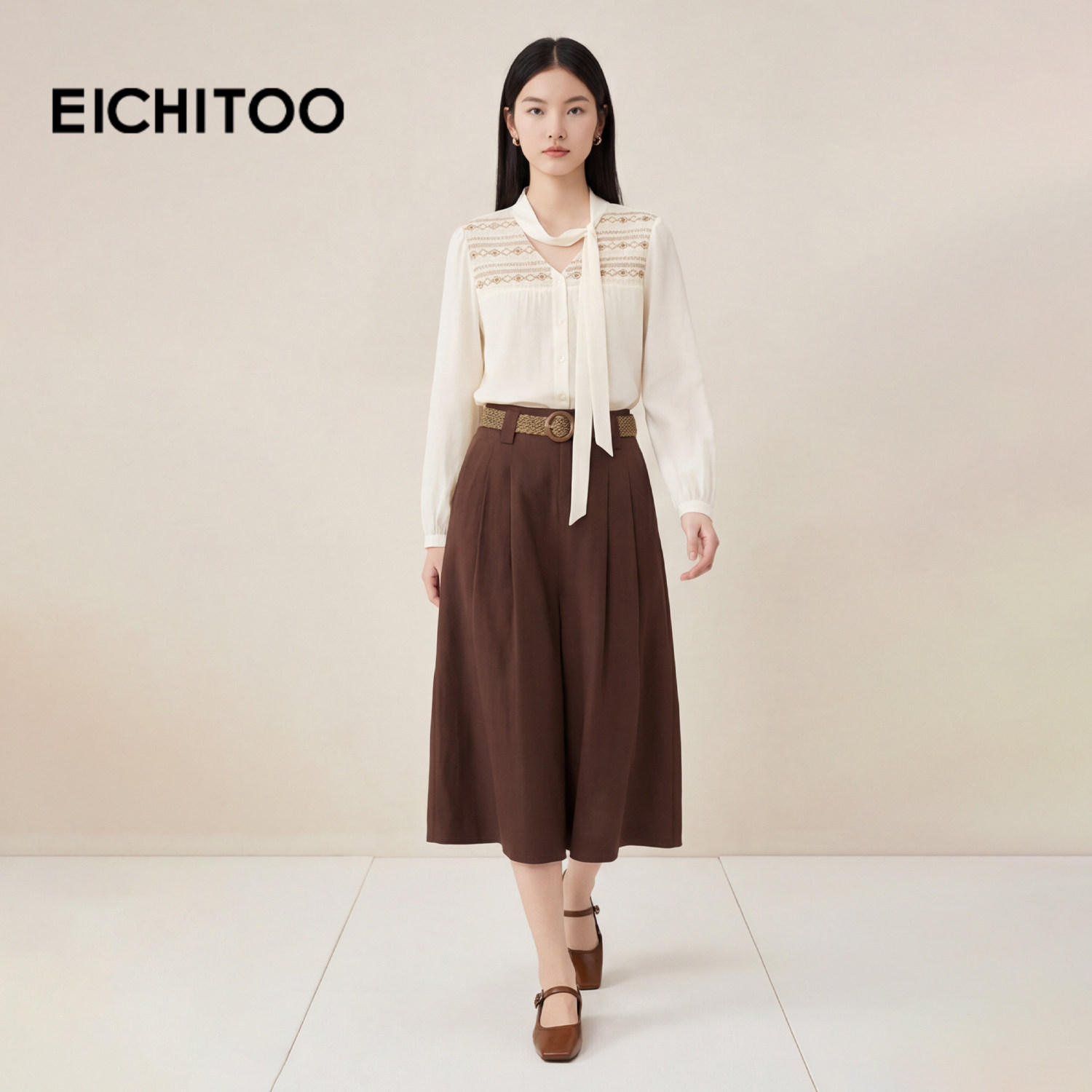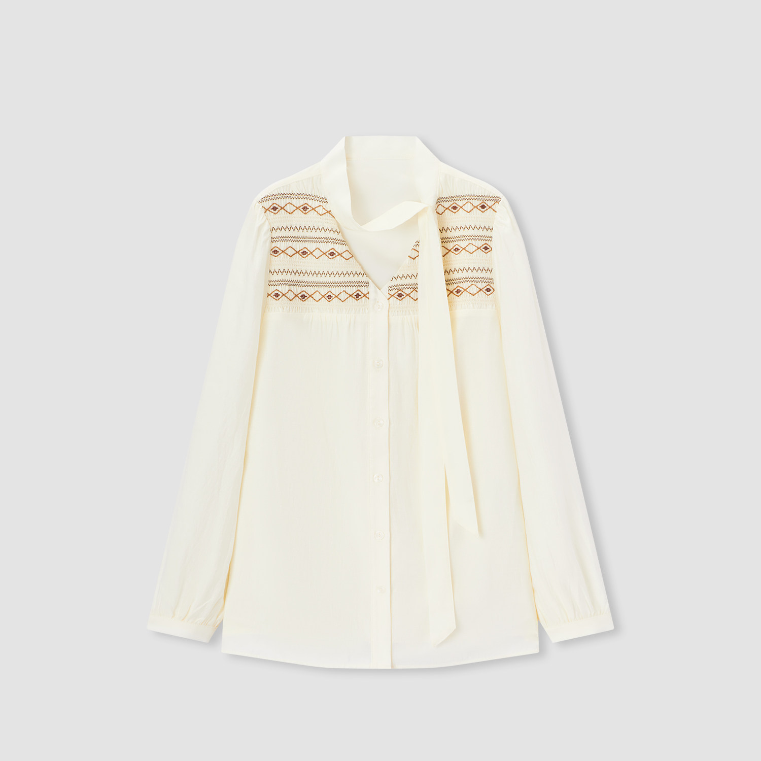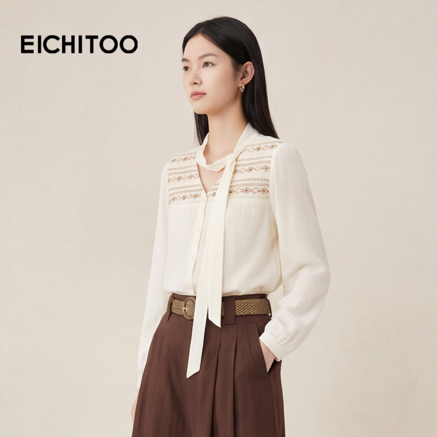 爱居兔简约绣花飘带V领衬衫女2026年春季新款百搭宽松雪纺上衣