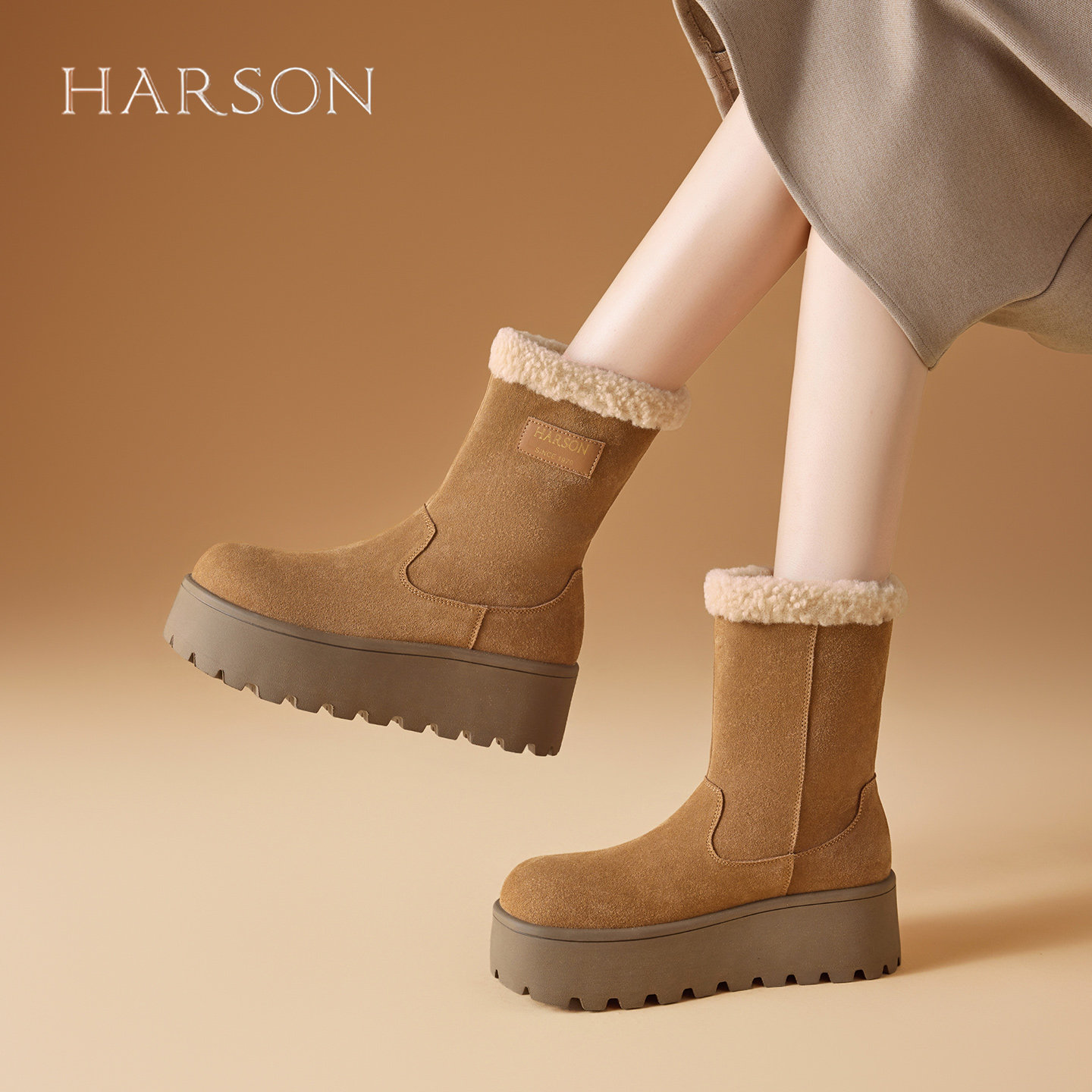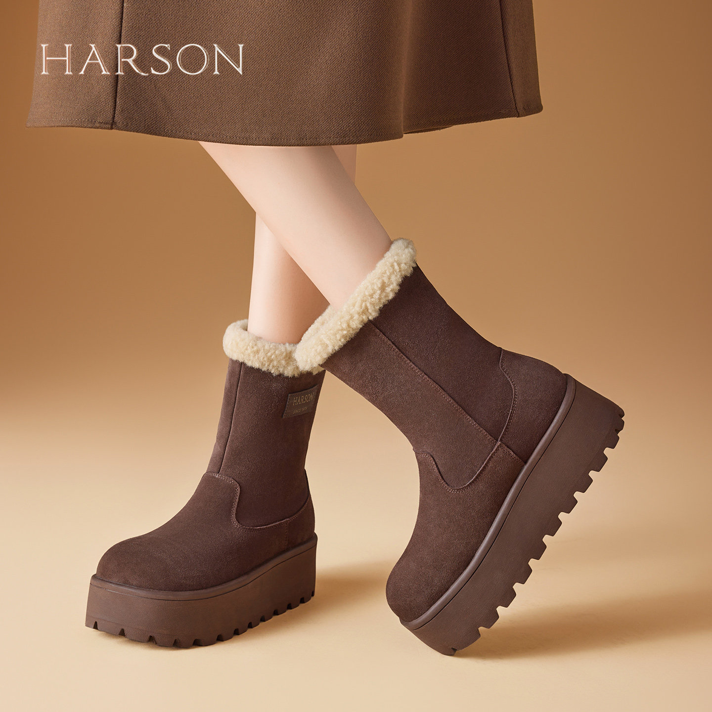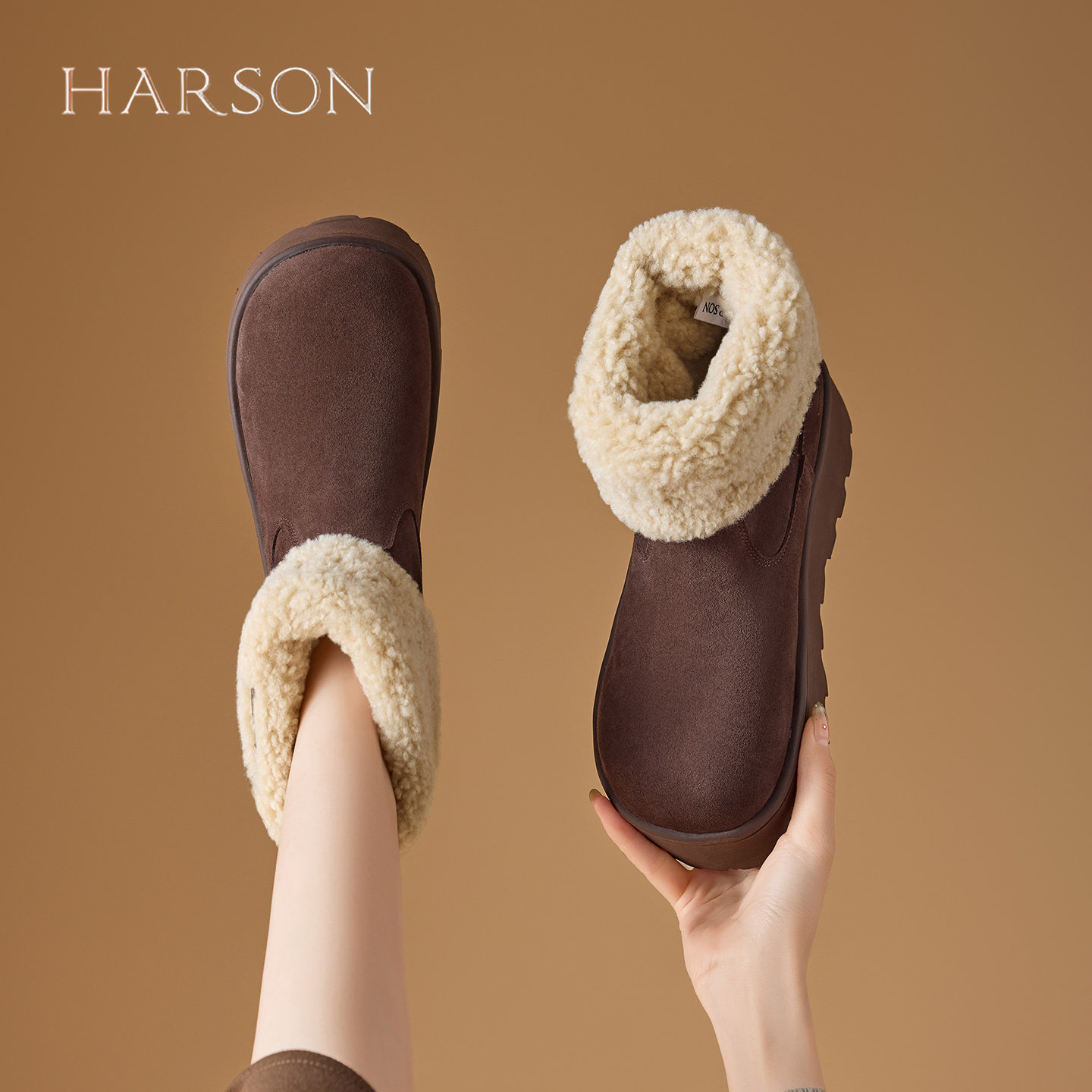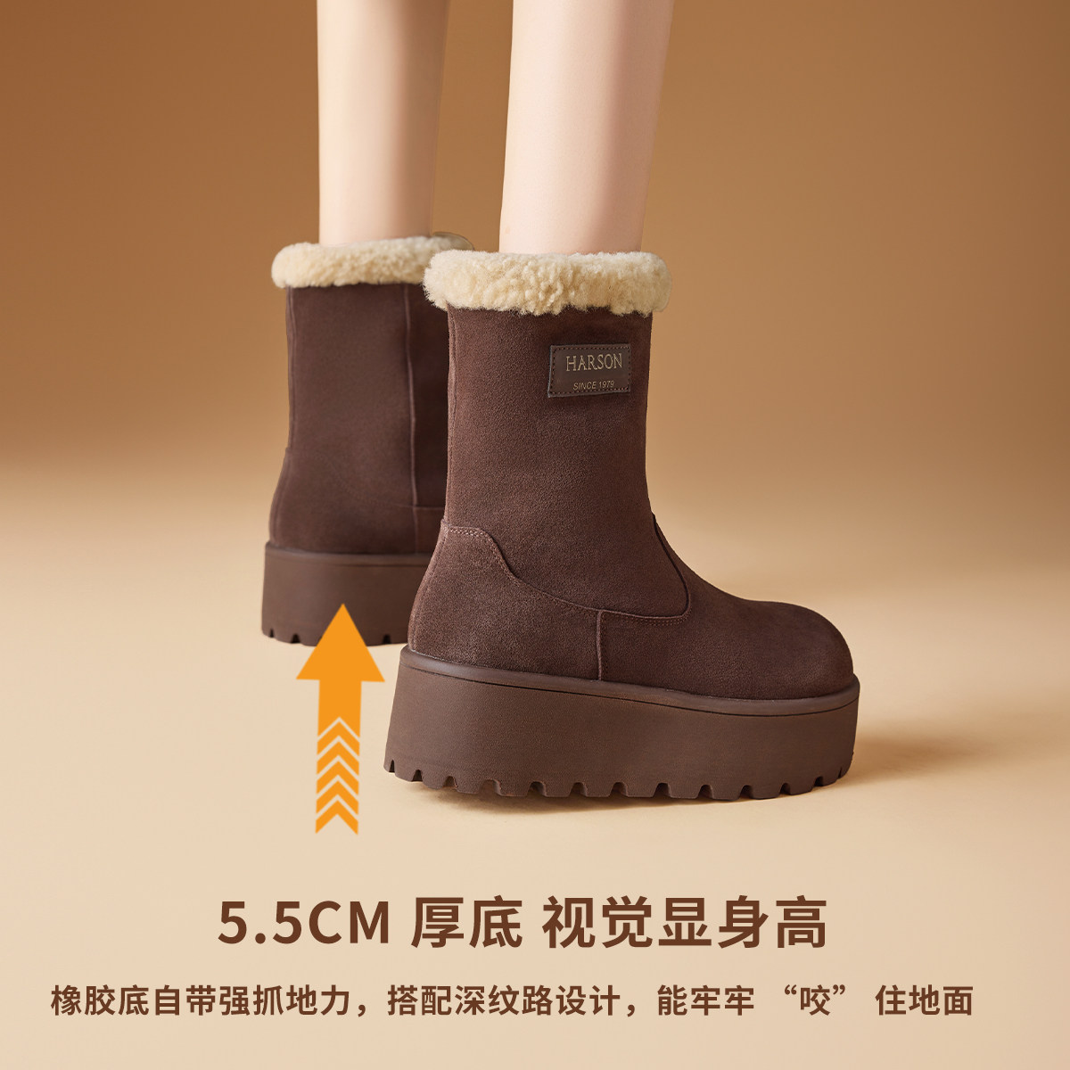 哈森头层牛皮时尚休闲厚底雪地靴女鞋子2025冬季新款加绒保暖棉鞋