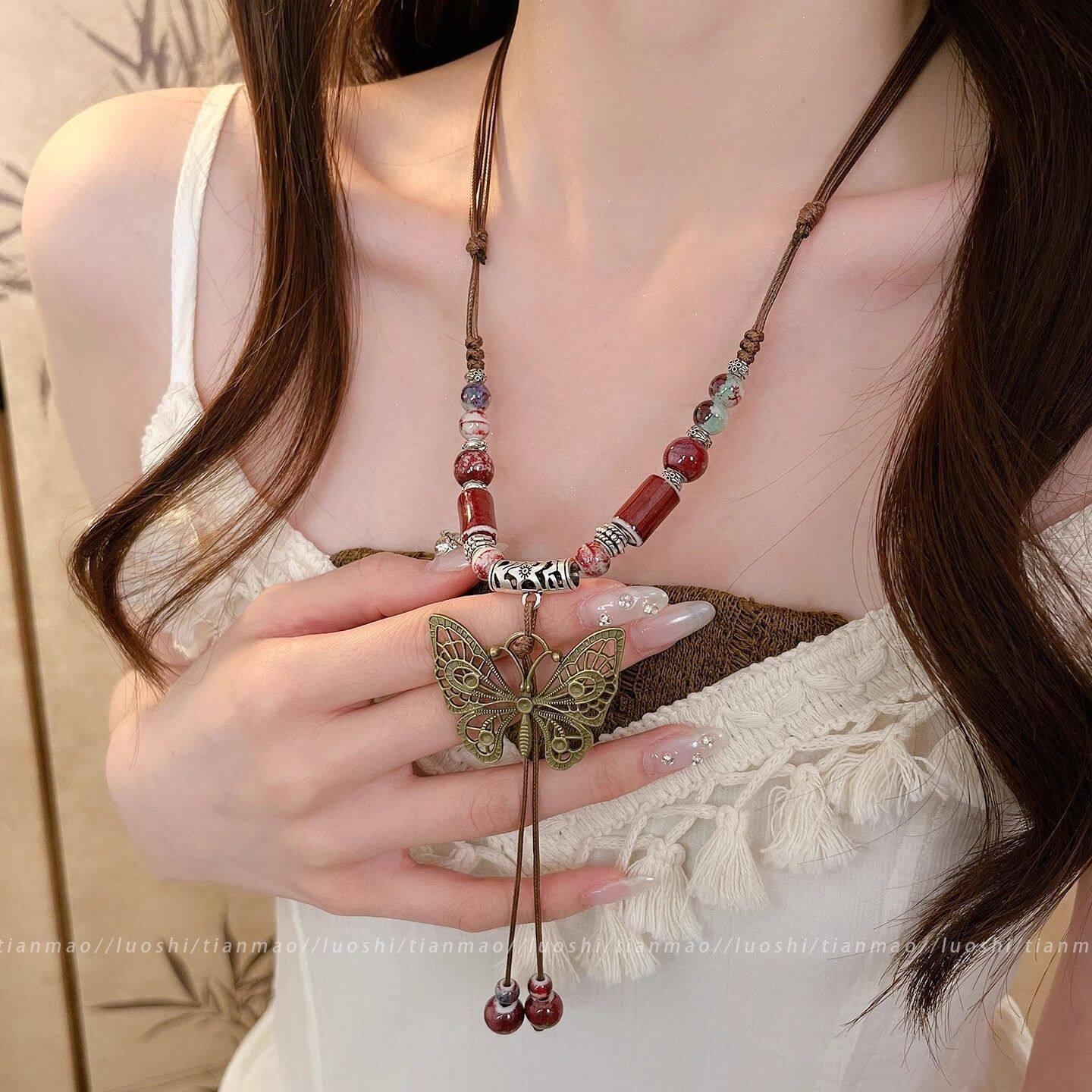 新中式复古长款羽毛项链女民族风高级装饰毛衣链波西米亚吊坠配饰