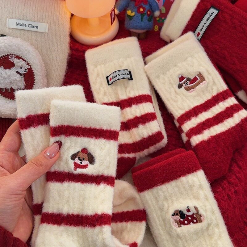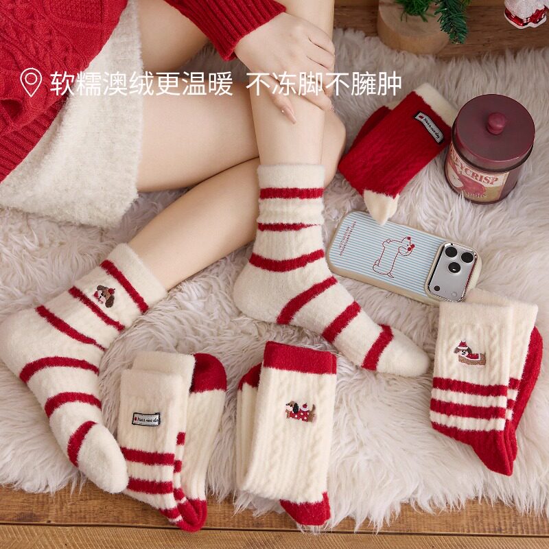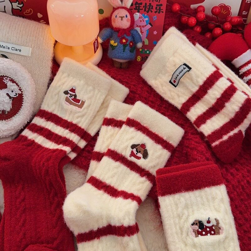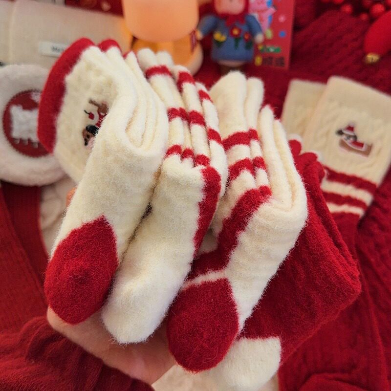 厚毛绒本命年红袜子女款中筒袜秋冬新年结婚马年2026情侣礼盒长袜
