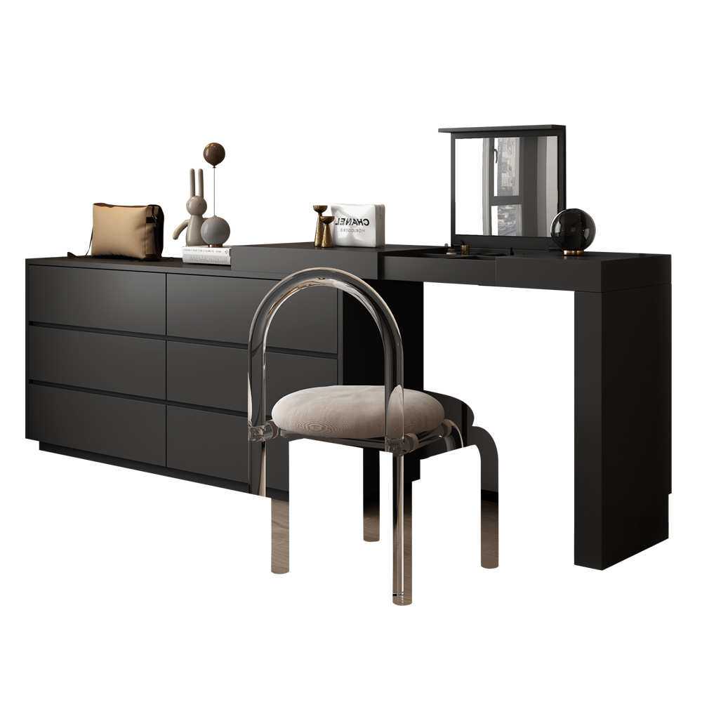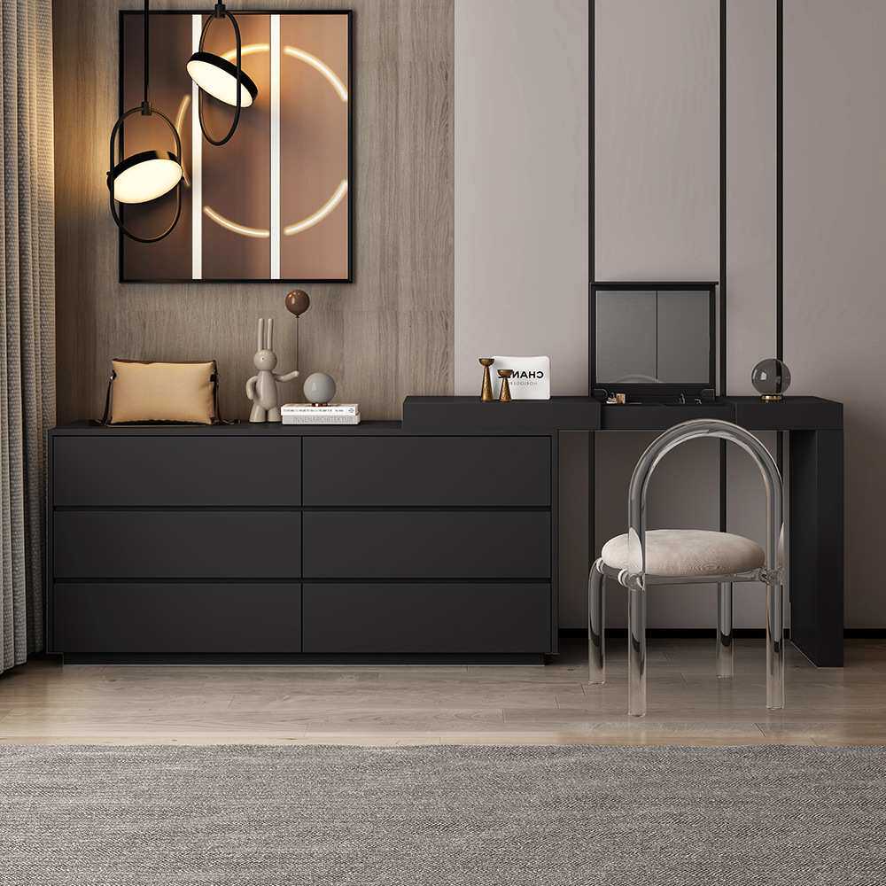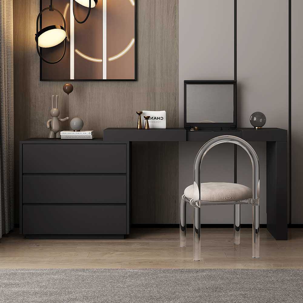 现代简约黑色复古实木翻盖梳妆台卧室斗柜组合收纳一体伸缩化妆桌
