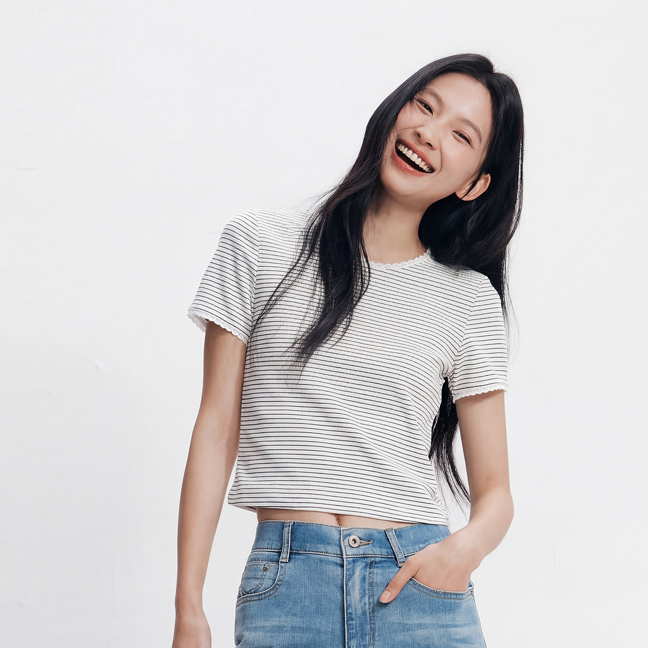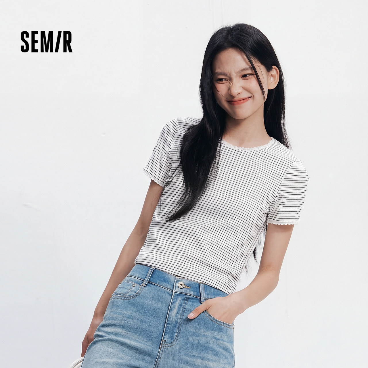 森马短袖T恤女夏季短款蕾丝花边圆领紧身衣服显瘦温柔气质条纹衫
