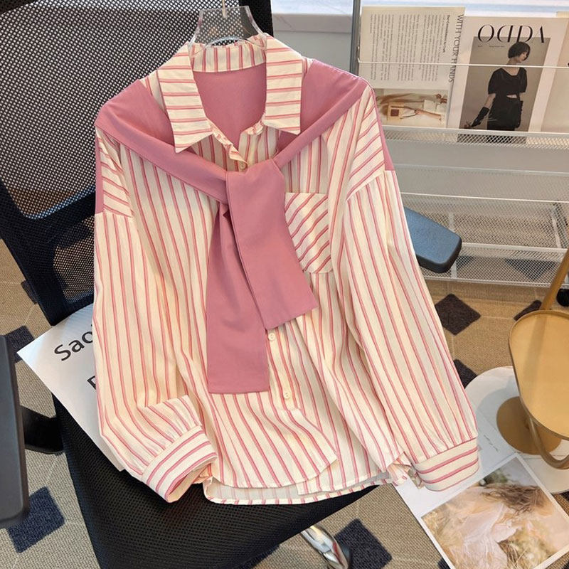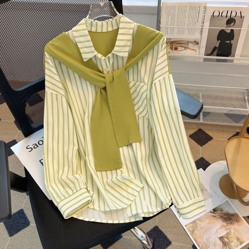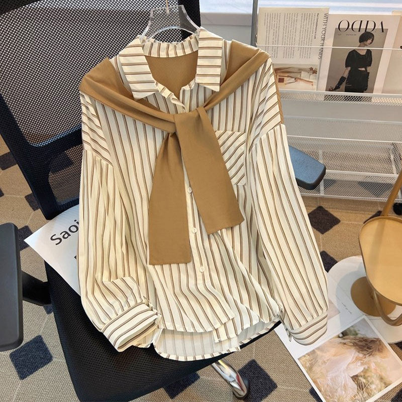假两件披肩条纹衬衫女2025春秋新款大码慵懒风宽松显瘦长袖衬衣潮