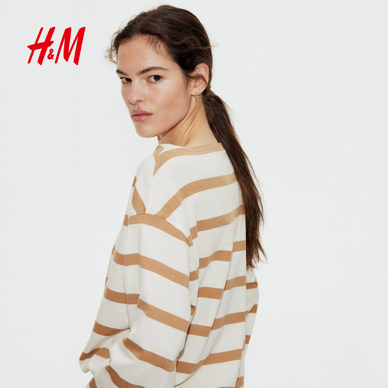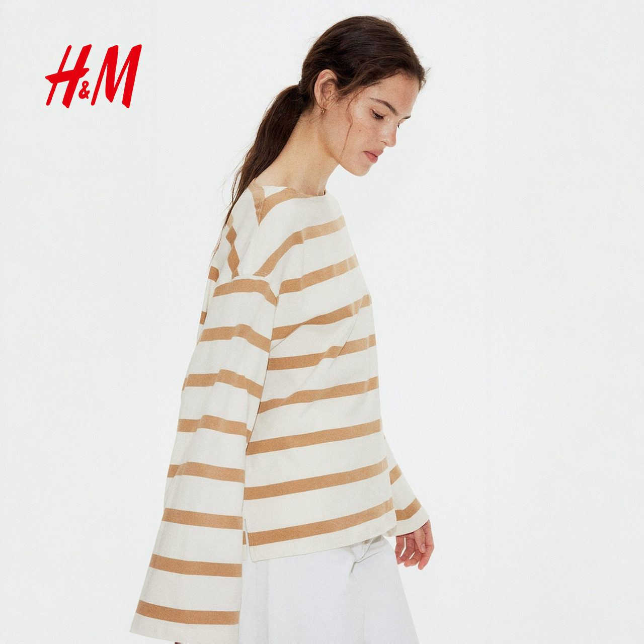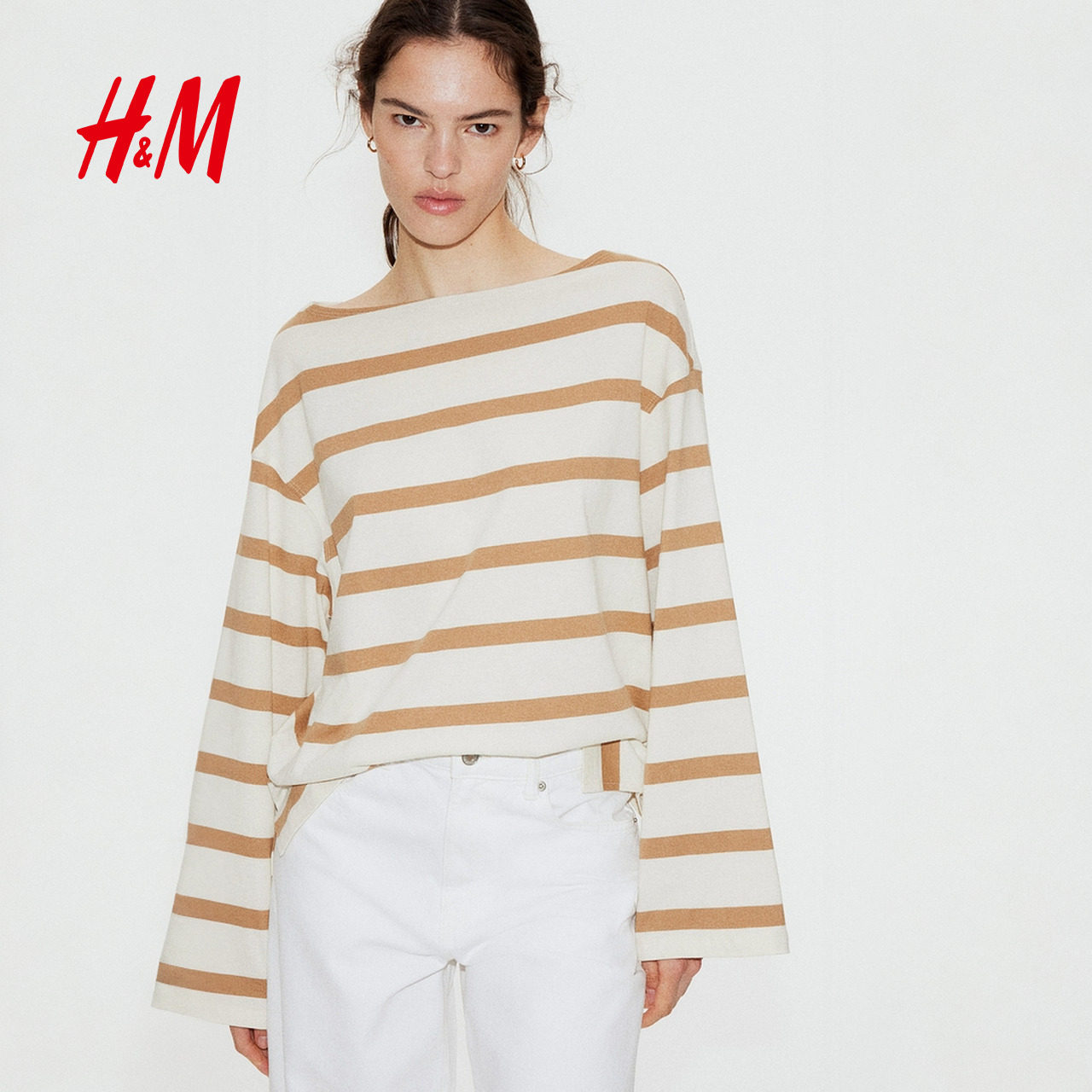 HM女装T恤春季冬一字领宽松气质休闲条纹落肩长袖打底上衣1269796