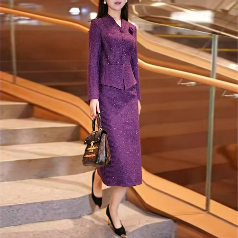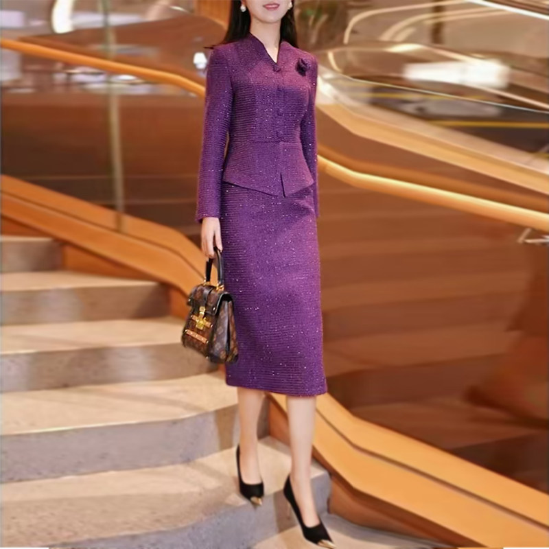 高级感气质紫色连衣裙2025新款女装秋冬高腰修身显瘦假两件包臀裙