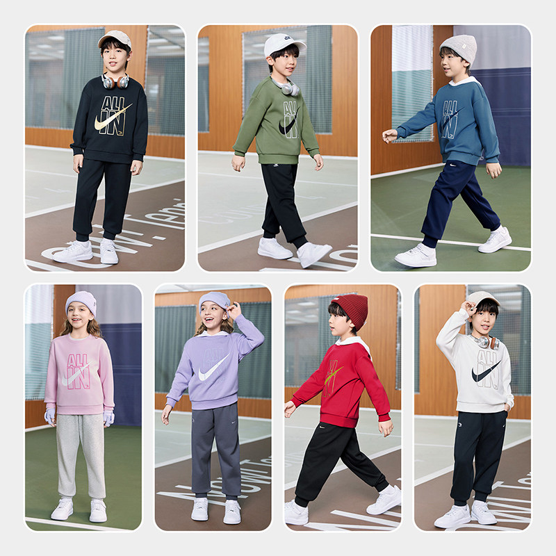 Nike 3brand男女童装加绒套装儿童卫衣卫裤运动2件套冬季红色新款