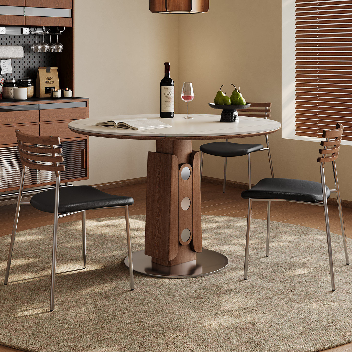实木伸缩餐桌家用小户型胡桃木色可变圆桌靠墙正方形岩板折叠餐桌