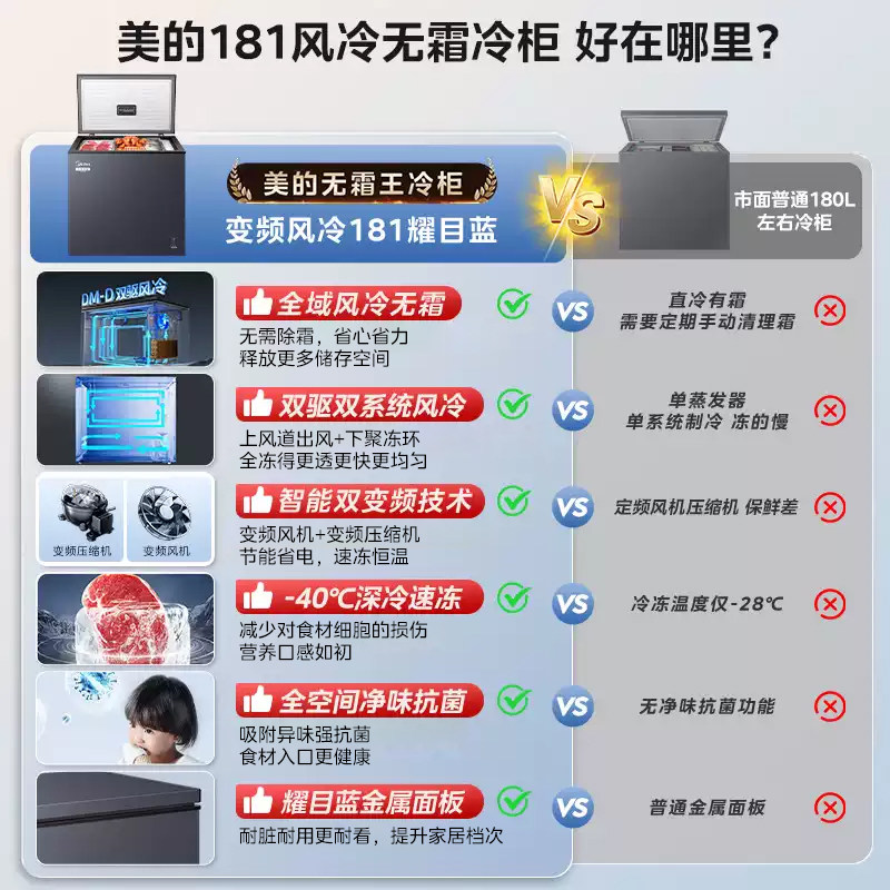 美的无霜王181小冰柜风冷家用双变频冷柜小型冷冻冷藏两用冰箱