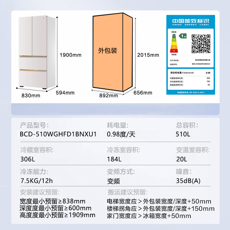 海尔麦浪510L超薄零嵌入式冰箱家用法式多门一级能效风冷无霜官方