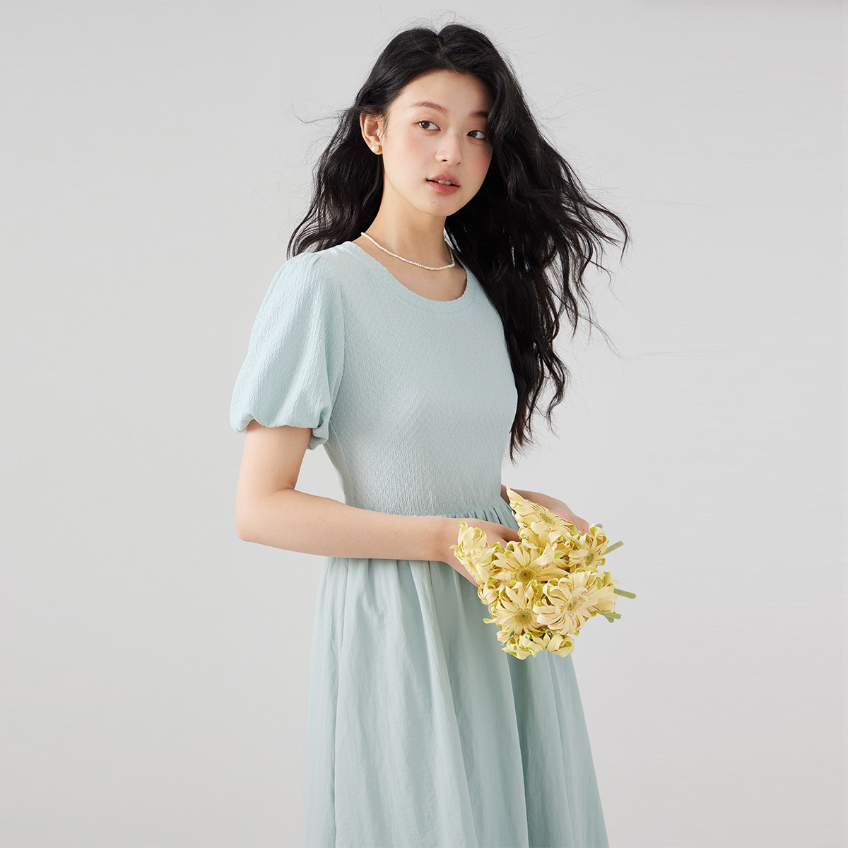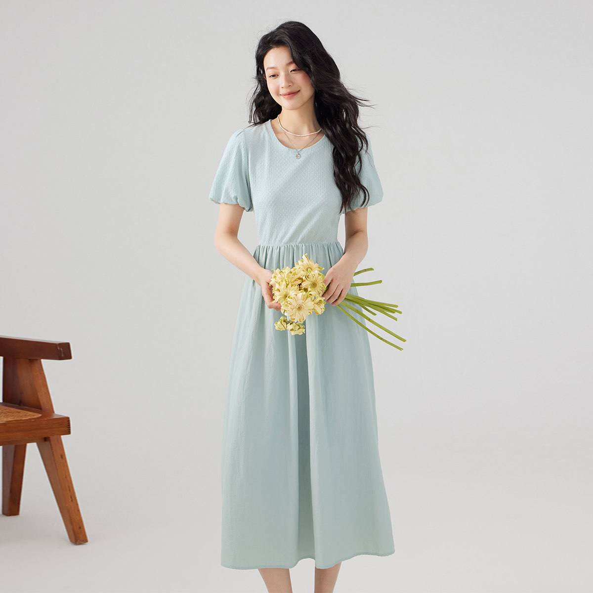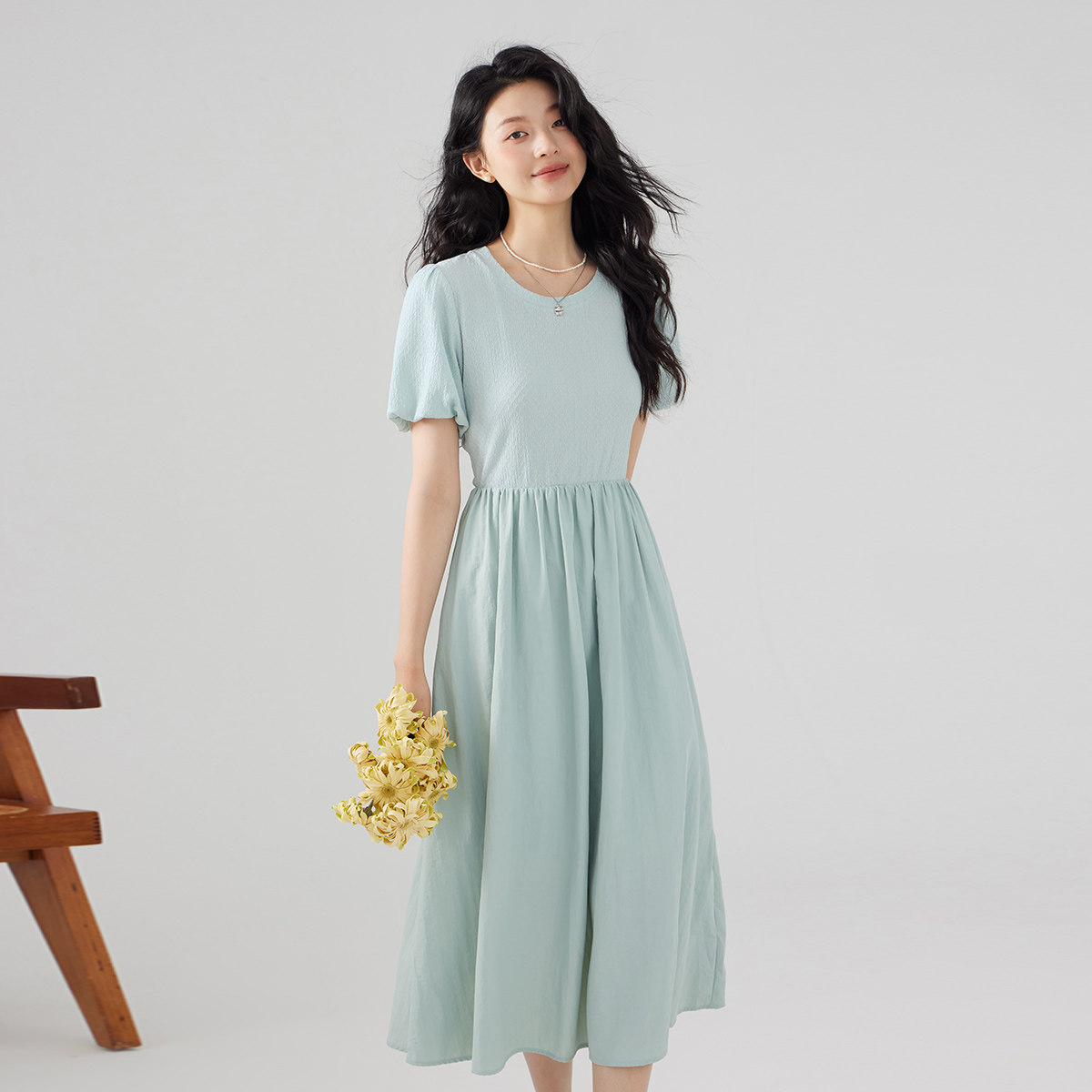 one more2025夏季休闲拼接短袖连衣裙女高级感法式泡泡袖收腰裙子