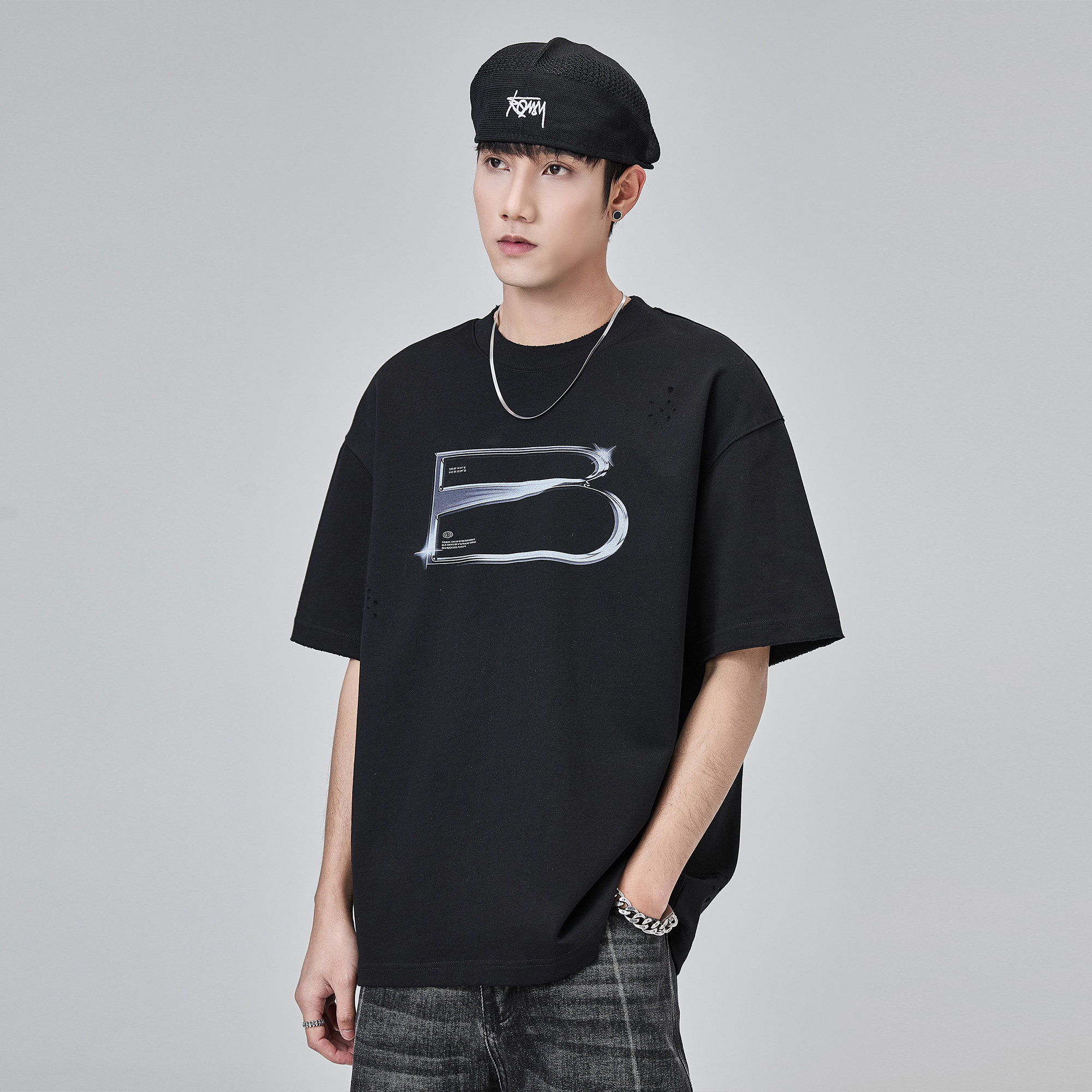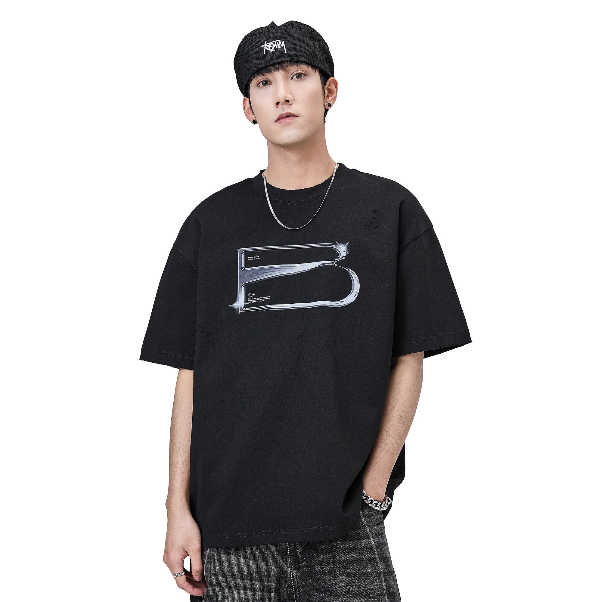 ALLIN 黑色印花短袖t恤男美式潮牌休闲夏季复古宽松圆领半袖上衣