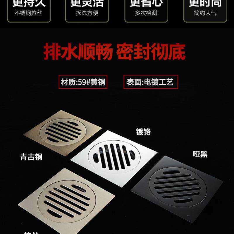 全铜加厚圆面条形防臭地漏淋浴房大排量潜水地漏湿干区洗衣机地漏