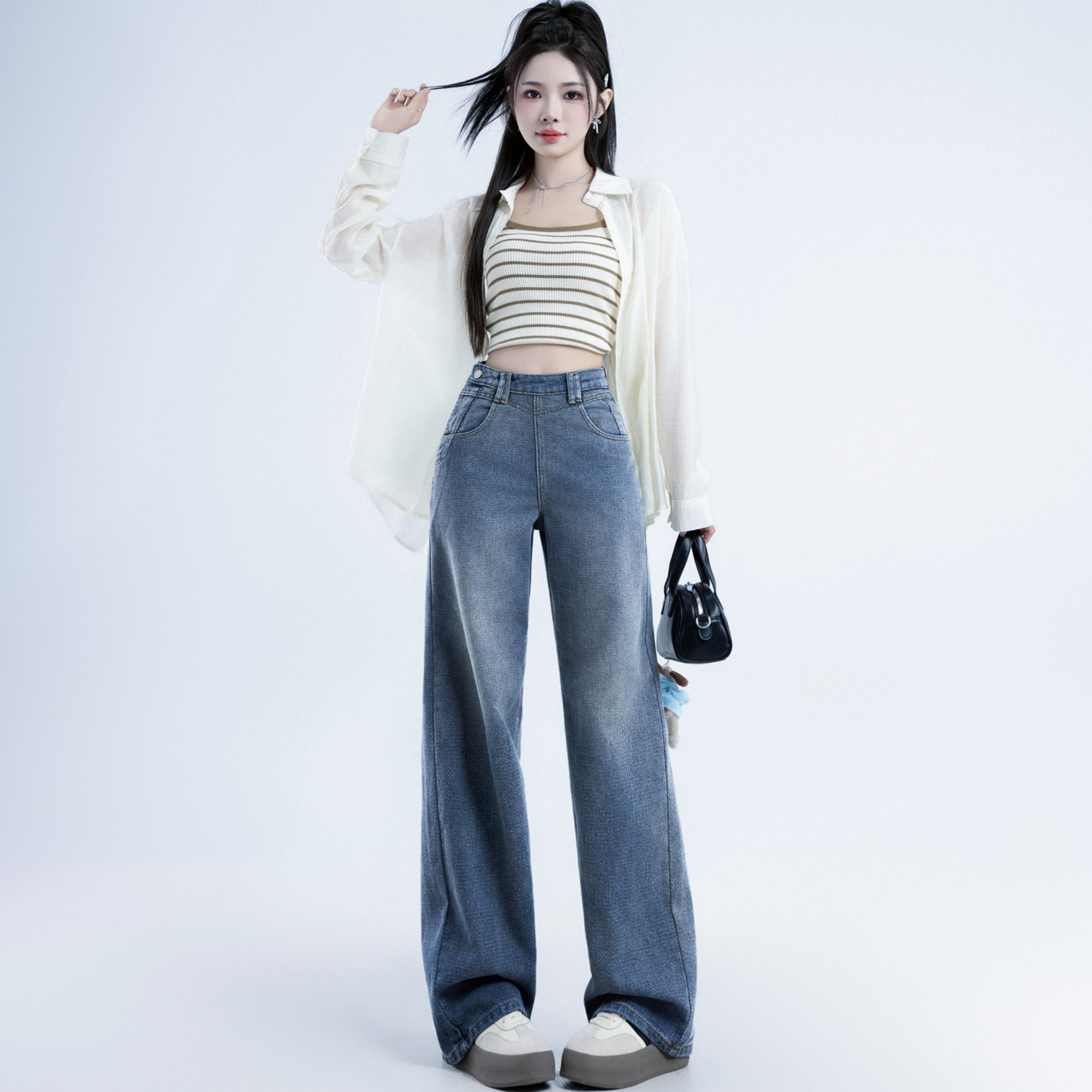 twosweet【超级裤神】四面弹重塑大长腿高腰直筒微喇叭原色牛仔裤