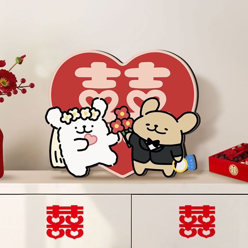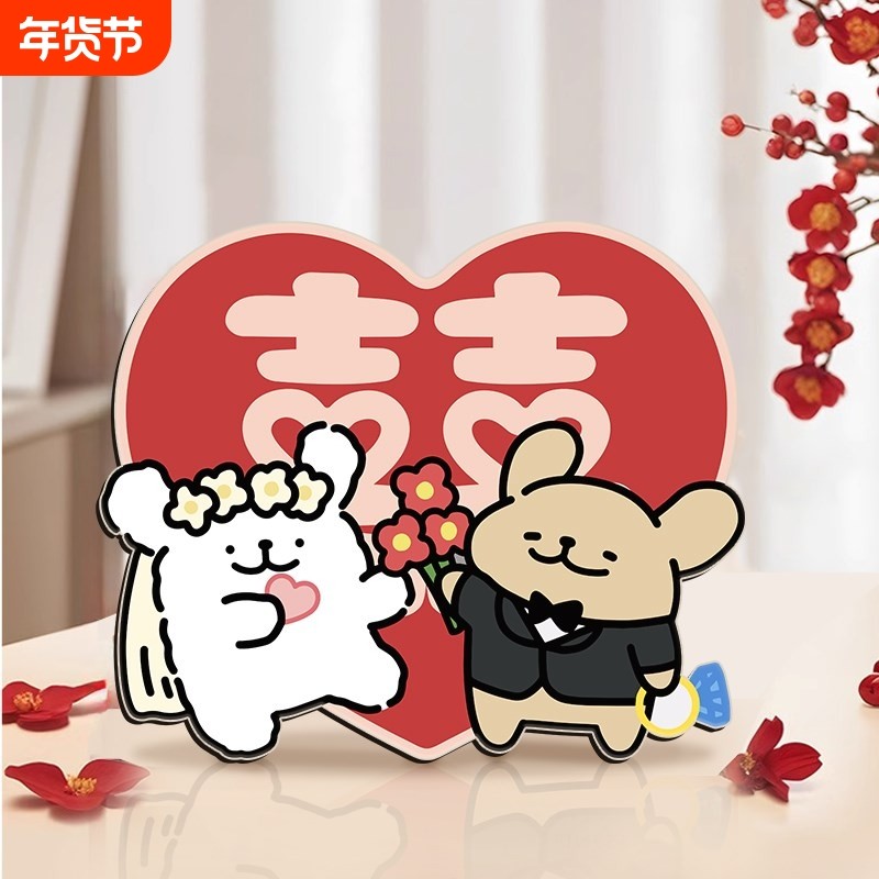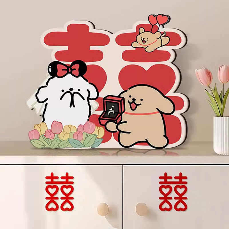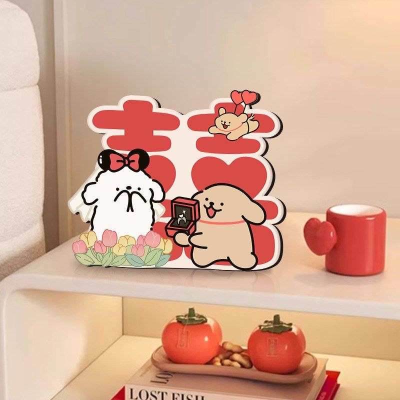 真创意线条小狗订婚囍字床头柜桌面摆件新婚O结婚婚房布置装饰!