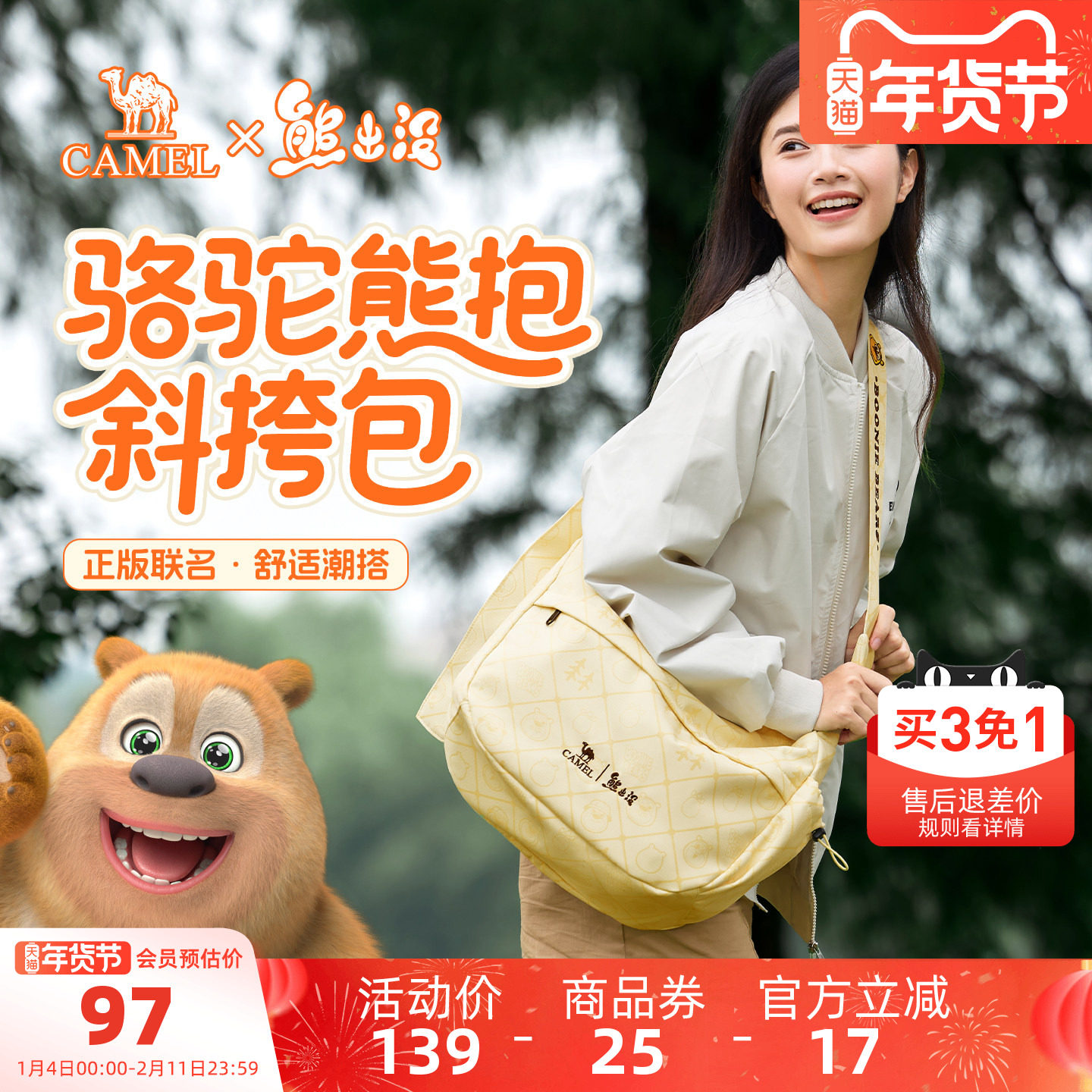 【熊出没联名】骆驼斜挎包女轻量化小挎包轻便通勤包旅行单肩小包