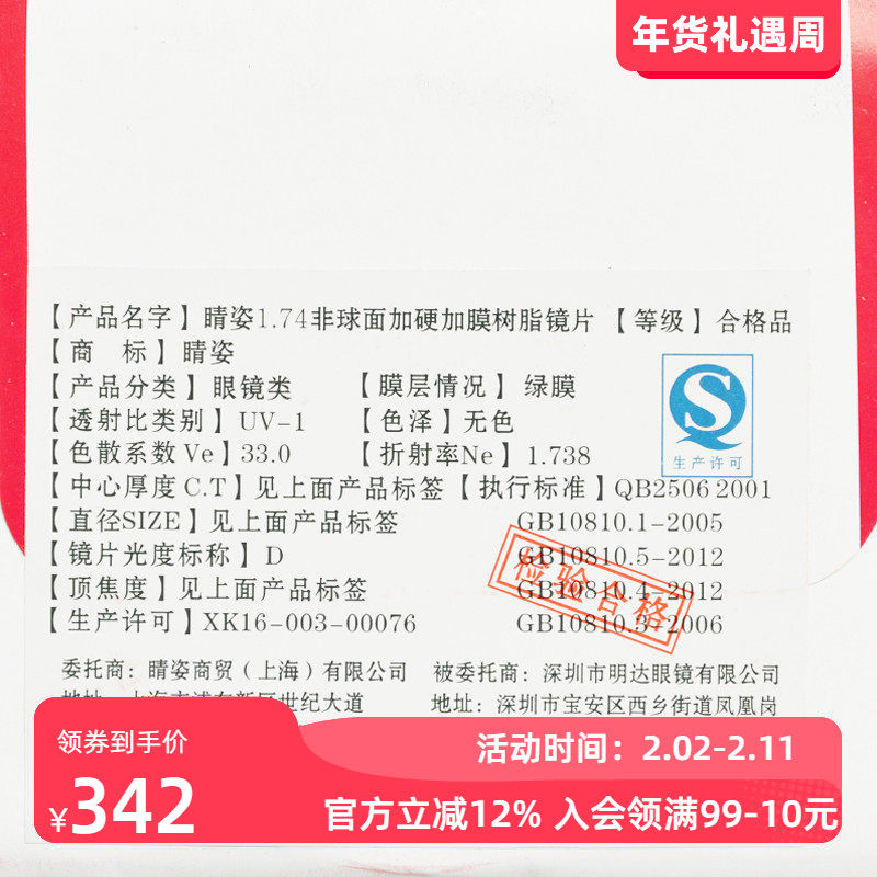 JINS睛姿近视眼镜升级1.74非球面普通镜片专用链接